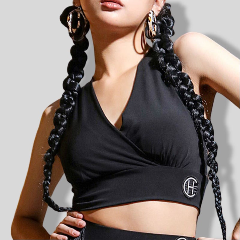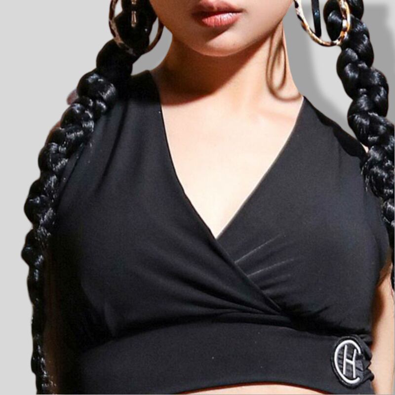 カシュクールデザインが女性らしいシルエットを強調し、Vネックがデコルテを美しく見せるクロップドトップス。