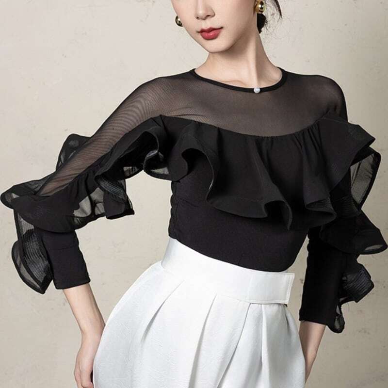 ▼シースルー ラウンドネック フリル レオタード トップス D00432