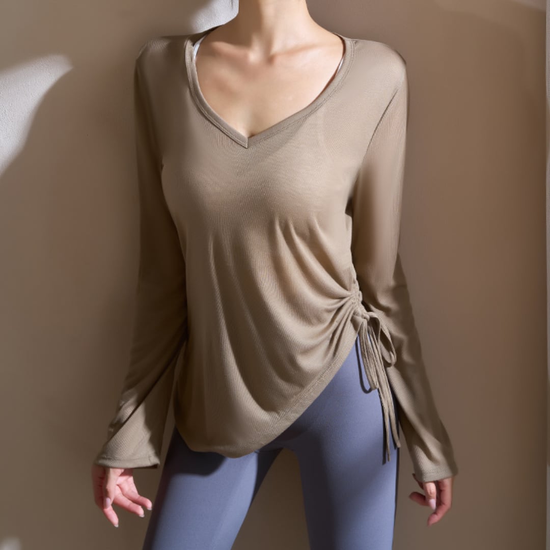 Vネックの優美さと、アシンメトリーな裾のデザインが洗練された印象を与えるトップス。