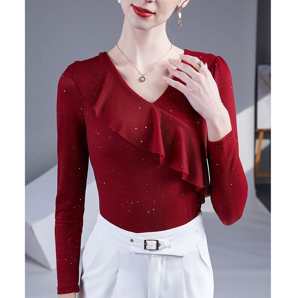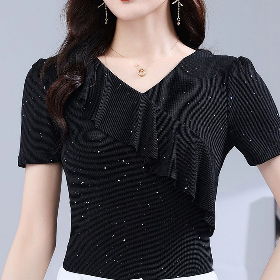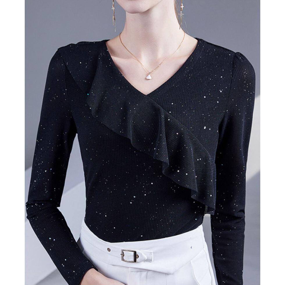 アシンメトリーなフリルが目を惹く、Vネックトップス。