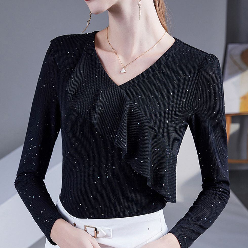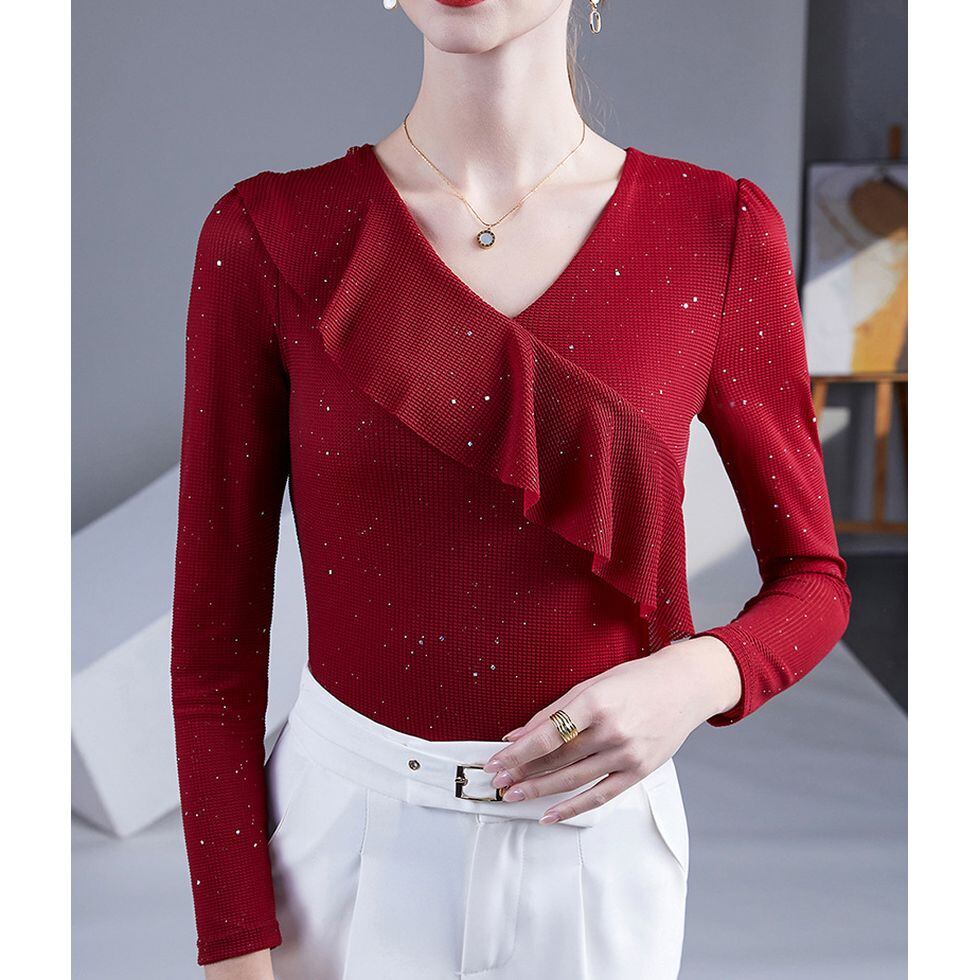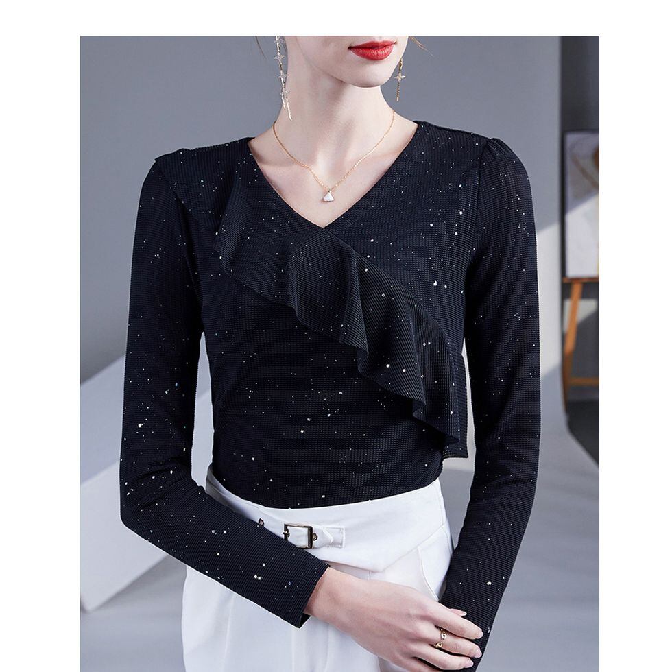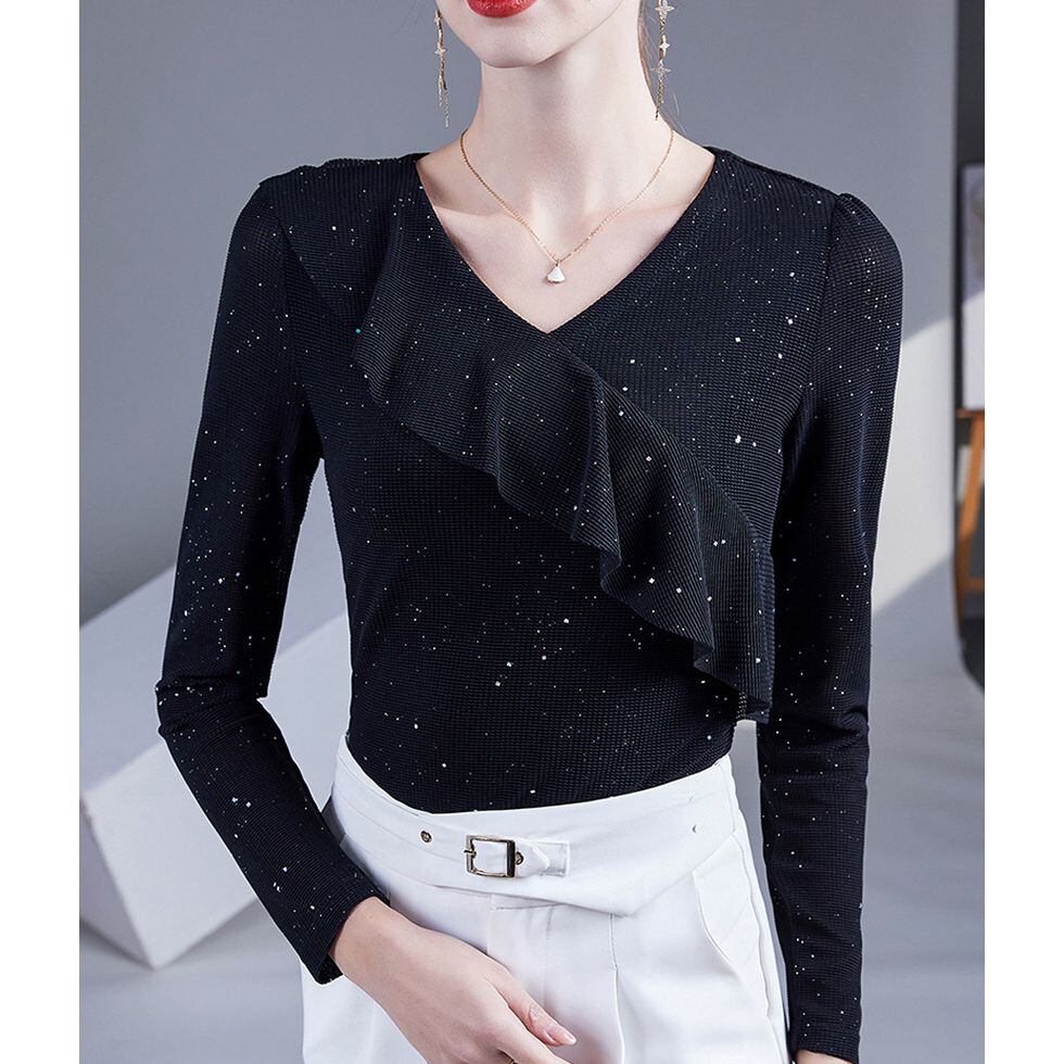 アシンメトリーなフリルが目を惹く、Vネックトップス。