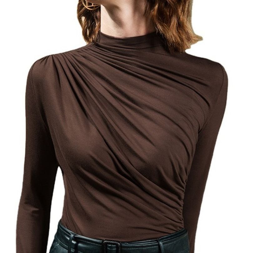 洗練されたドレープが美しい、ハイネックロングスリーブトップス。