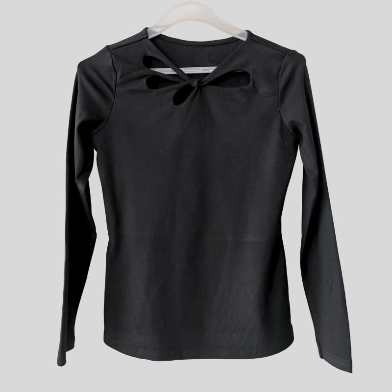 胸元のユニークなカットアウトが目を惹く、長袖トップス。