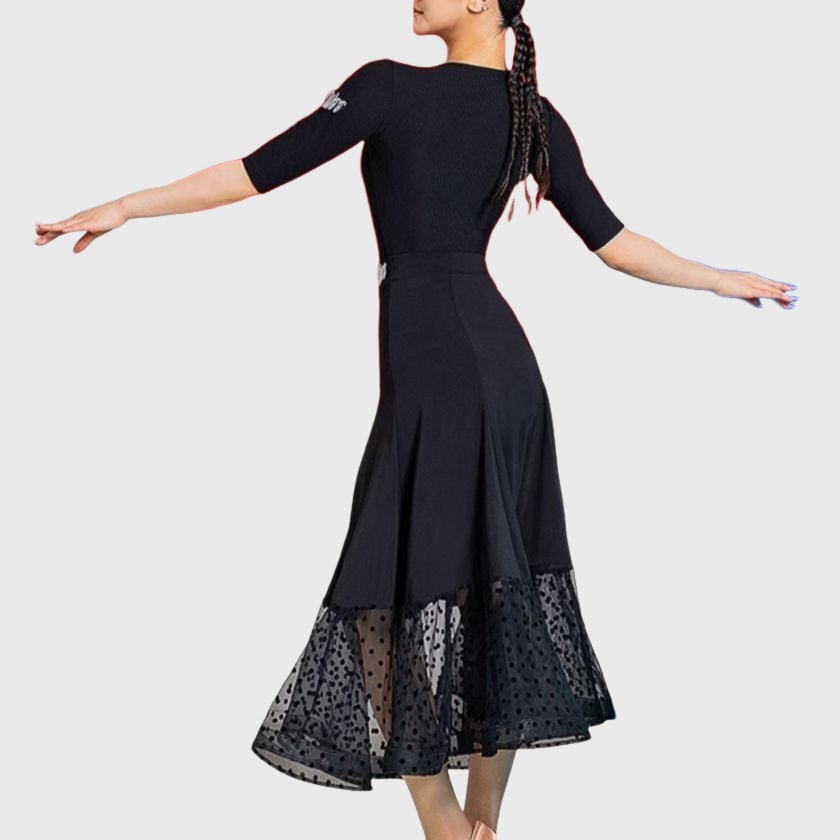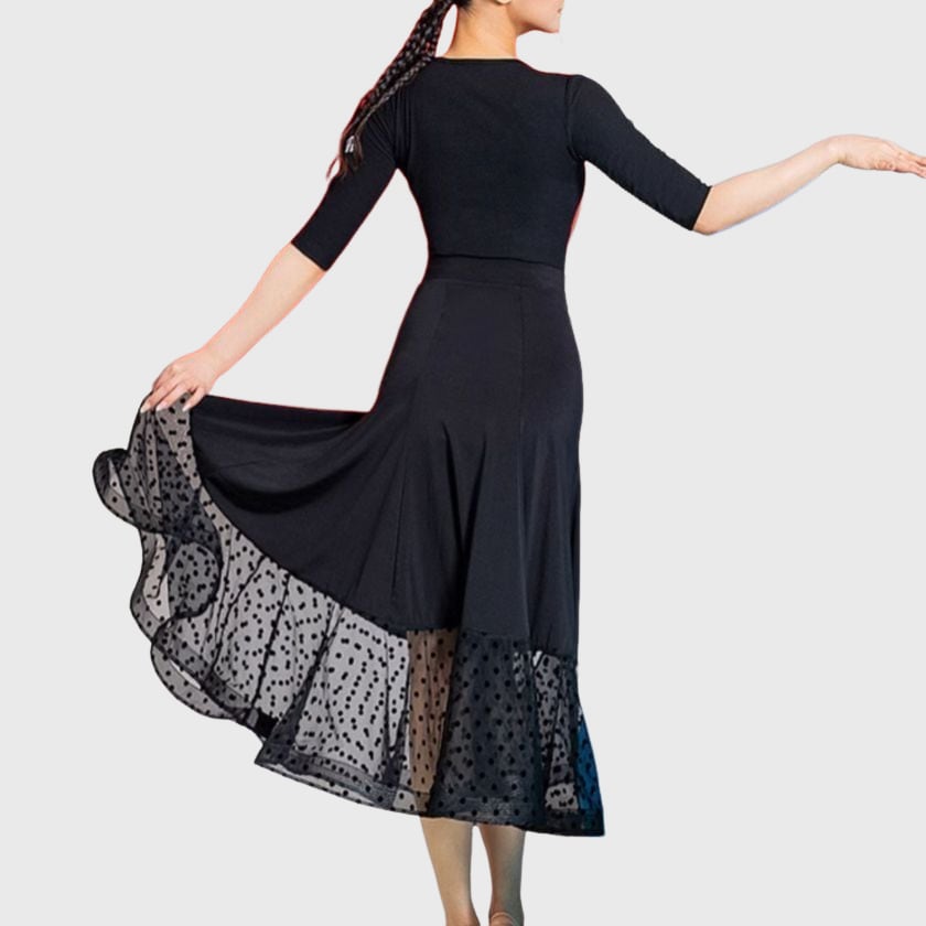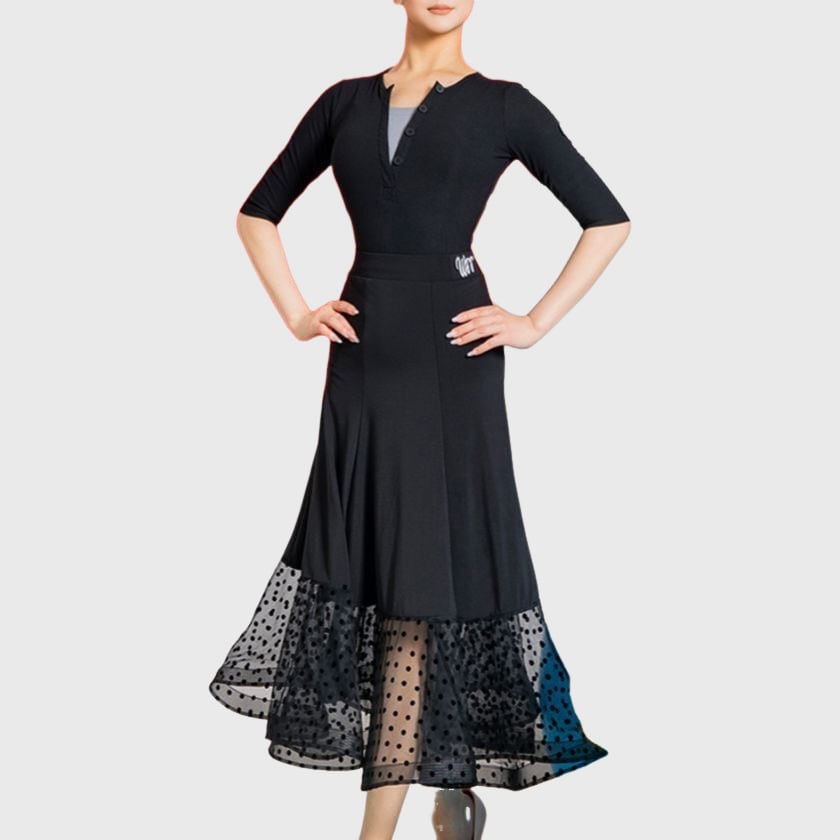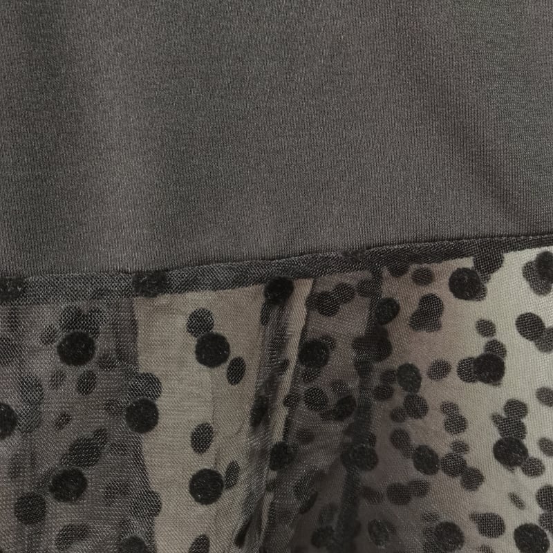ドット柄のシフォンが華やかさをプラスして、レッスンやダンスイベント等、幅広いシーンで活躍できる一着です。
