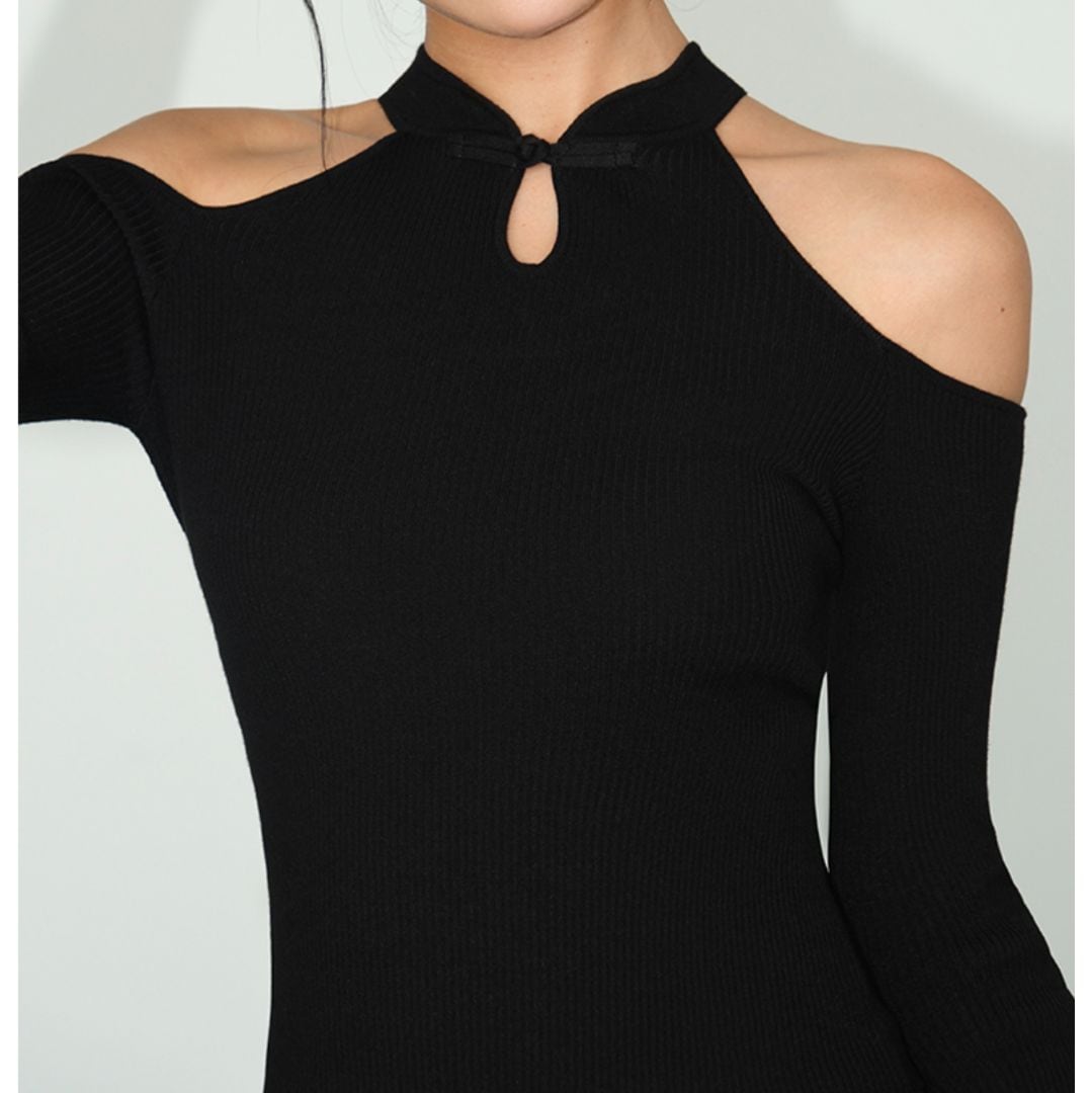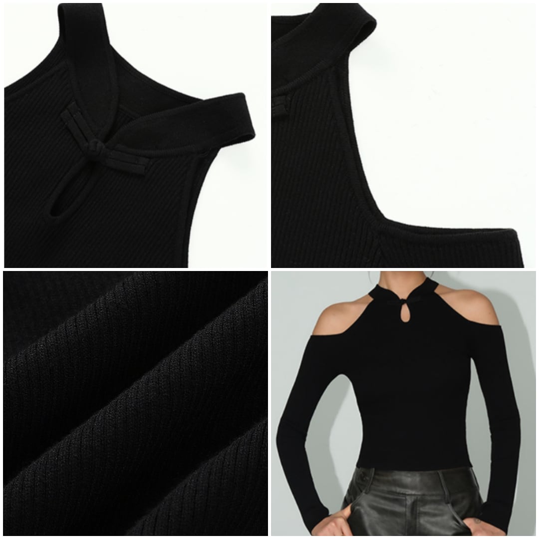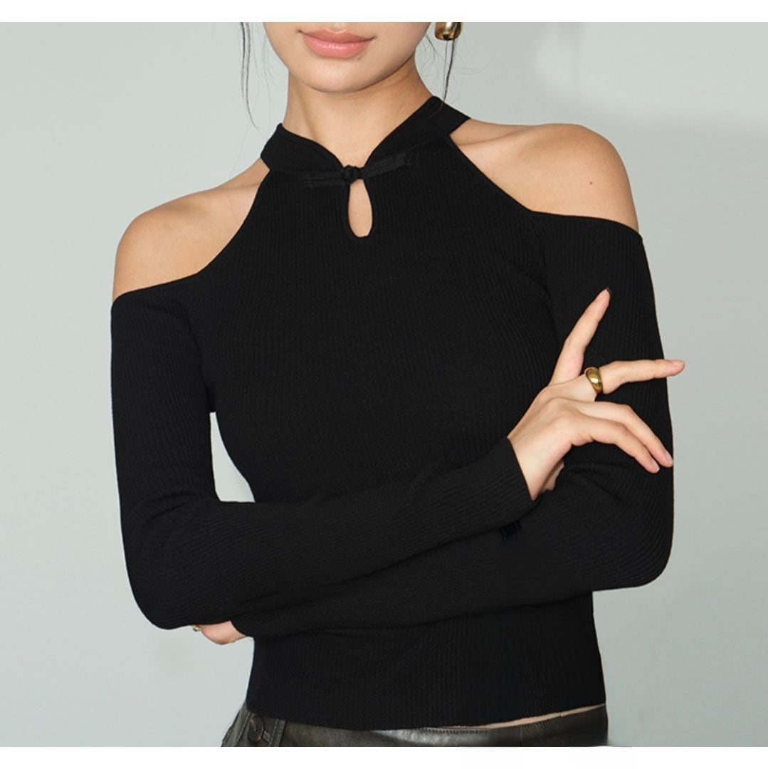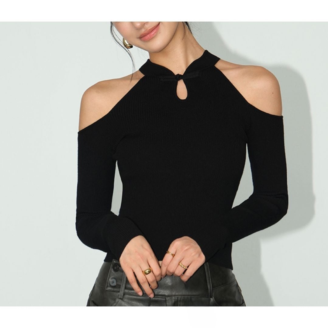 特徴的なハイネックデザインと、視線を集めるショルダーカットが魅力的なトップス。