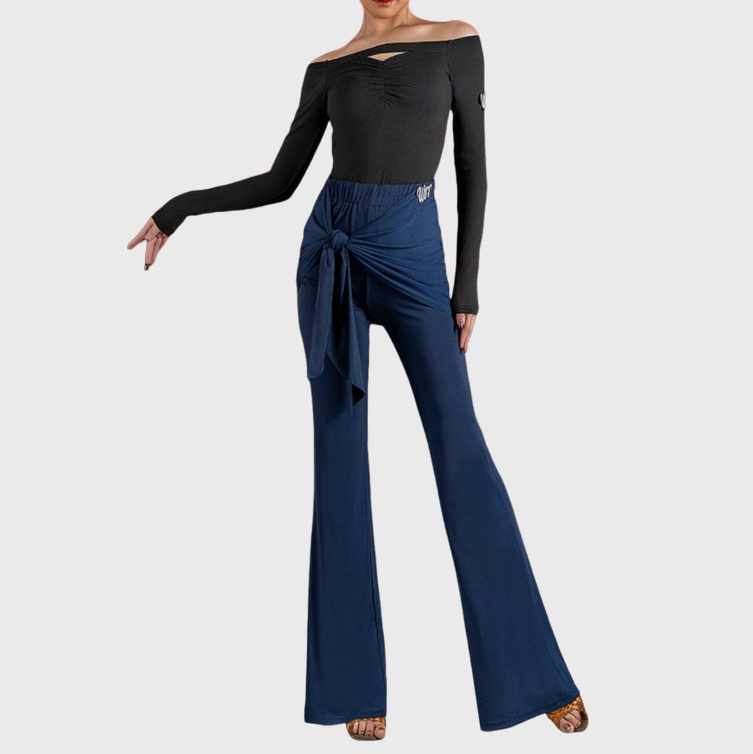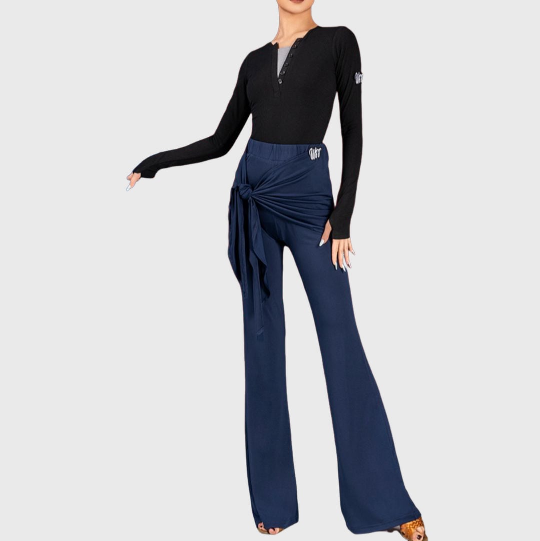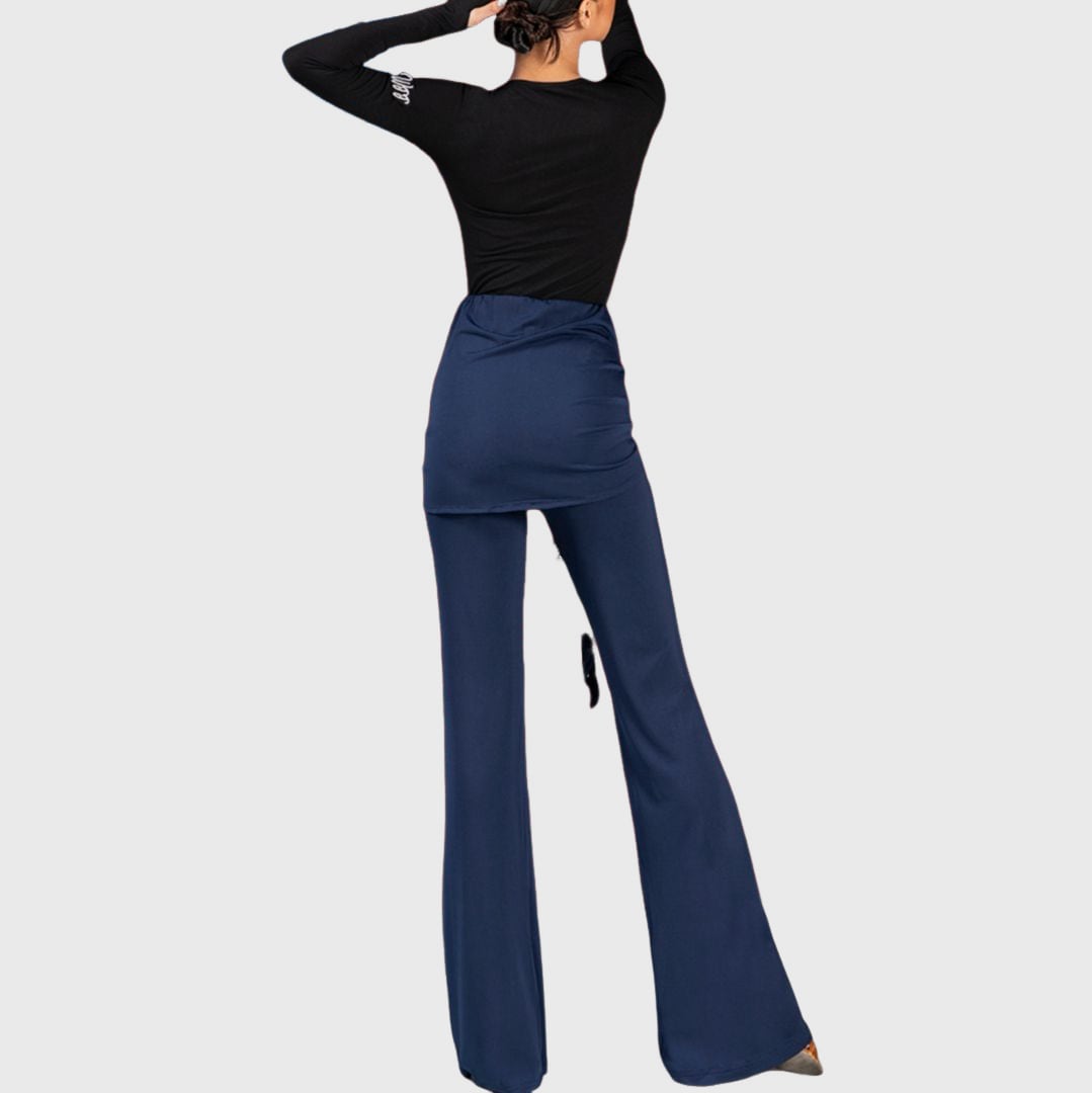 ウエストゴムとラップデザインが絶妙なバランスを生み出すフレアパンツ。