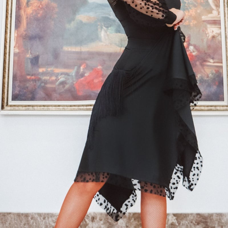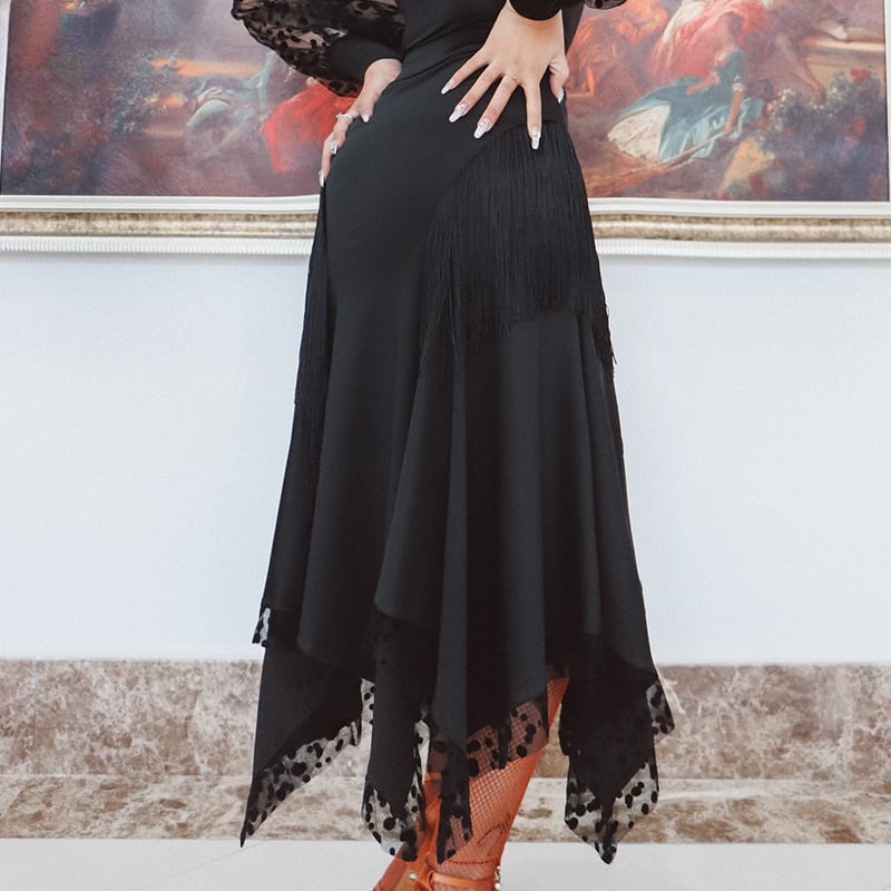 アシメトリーなヘムラインとフリンジが、洗練された動きを演出するロングスカート。