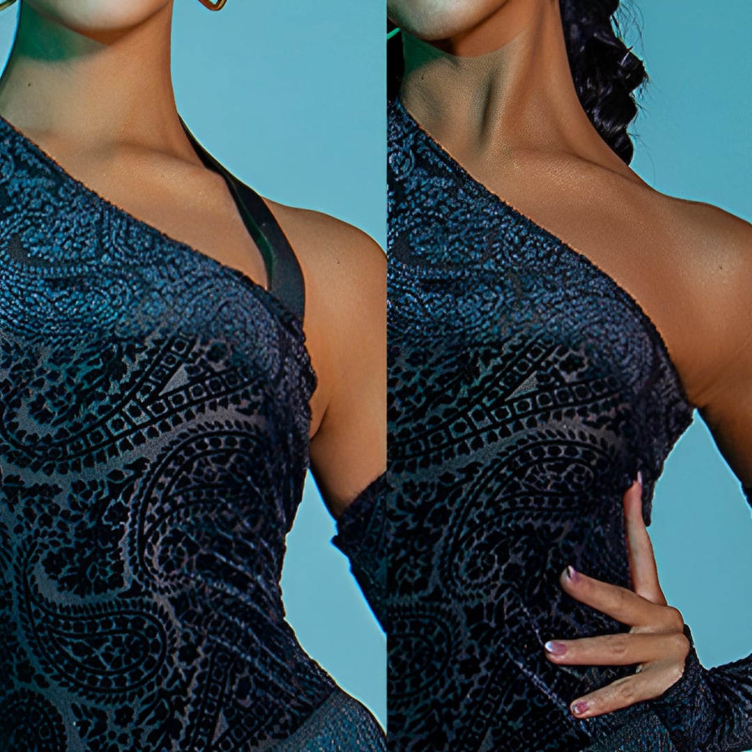 大胆にカットされたワンショルダーと、背中のオープンスタイルが、視線を惹きつけるラテンドレス。