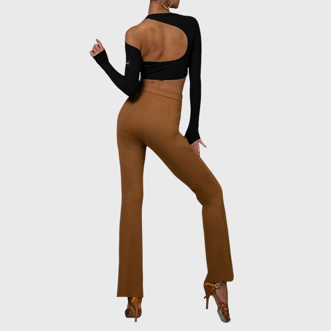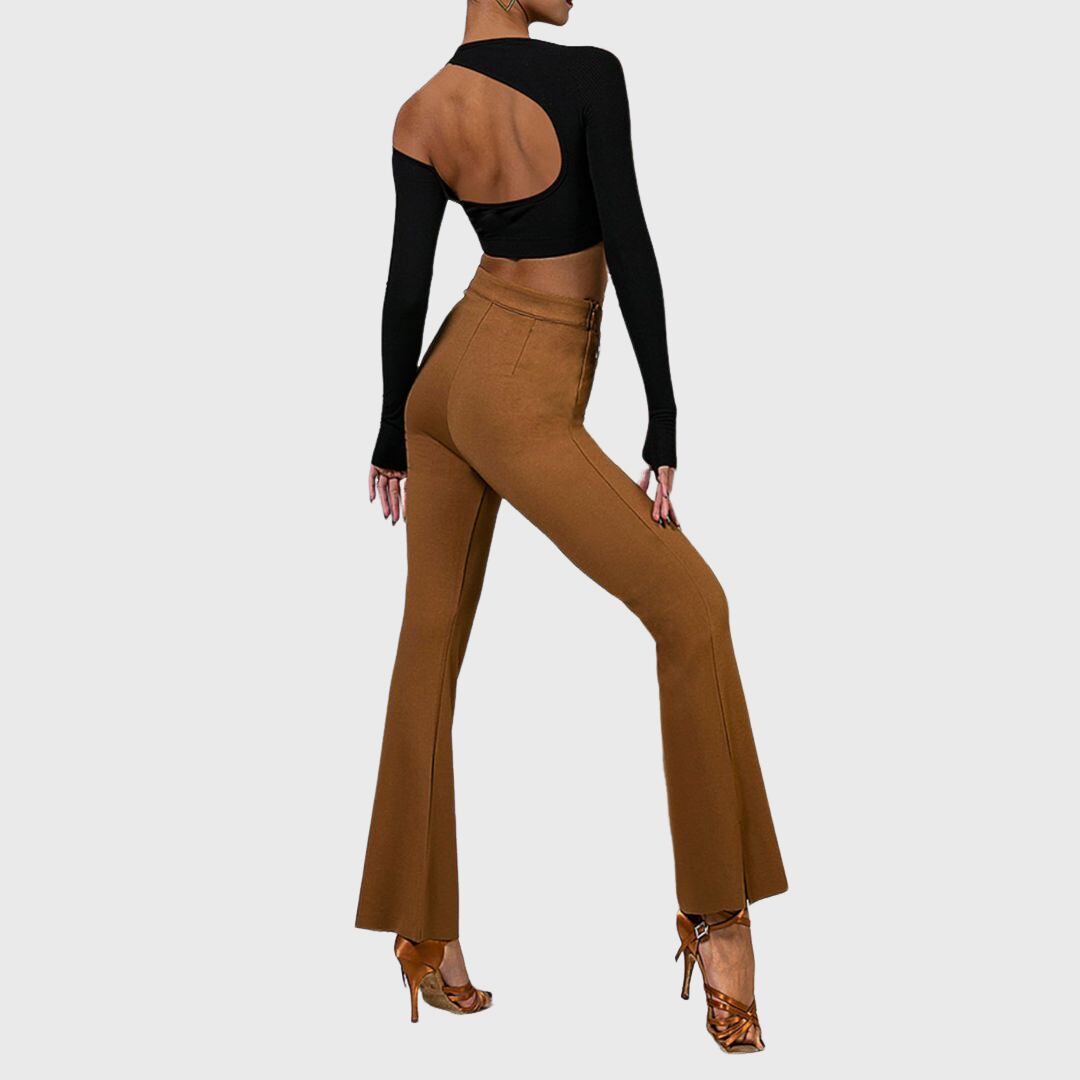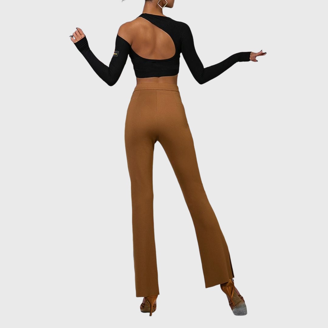 ウエスト部分のクロスデザインカットが、洗練されたシルエットを演出するフレアパンツ。