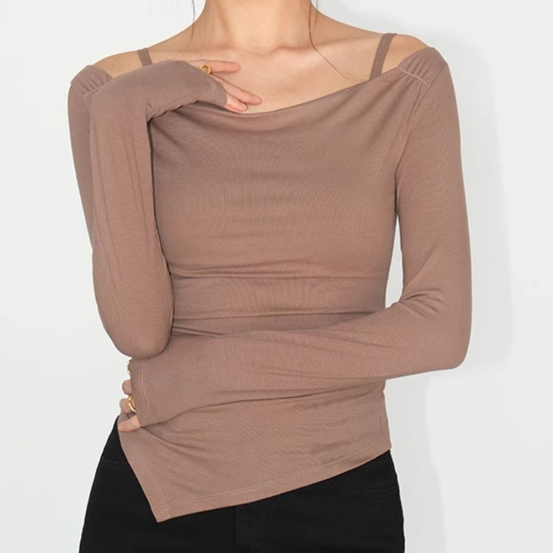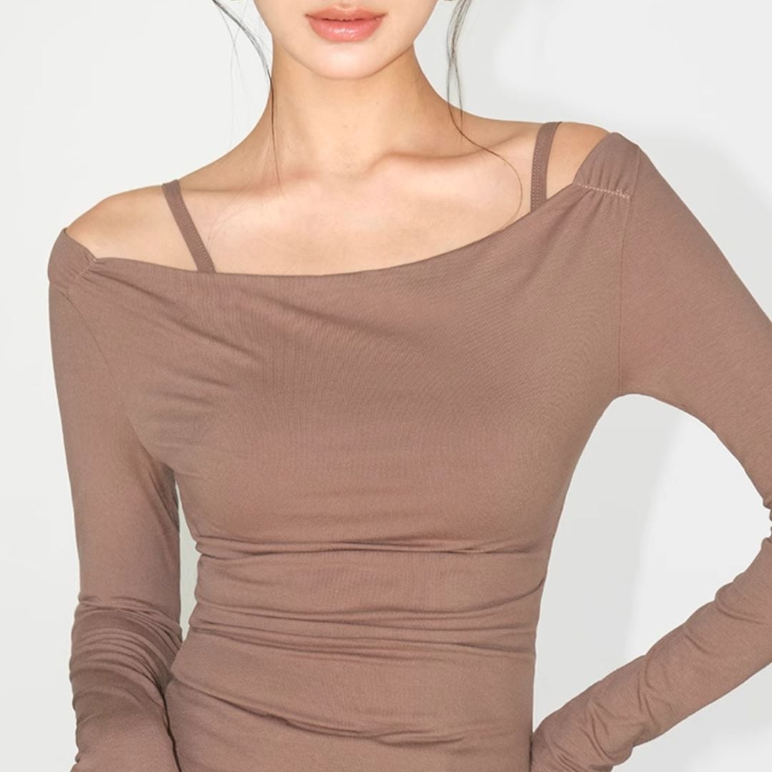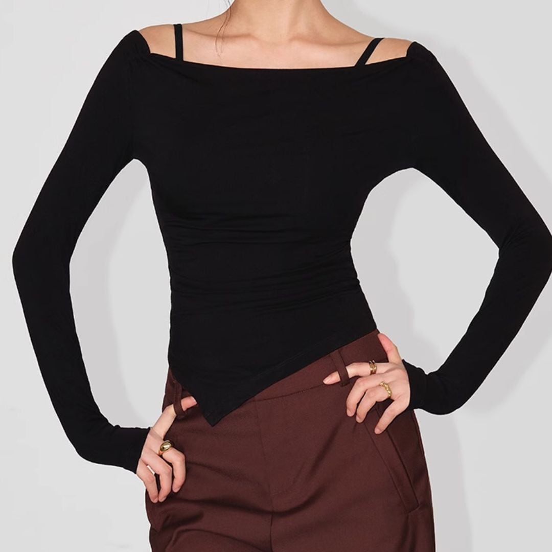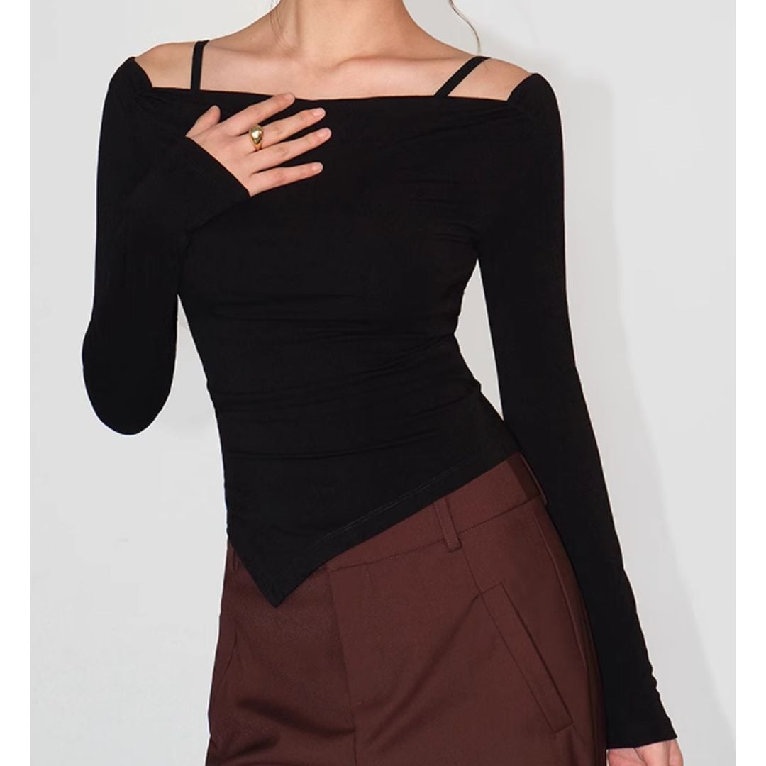 オフショルダーデザインとロングスリーブが織りなす、洗練されたタイトシルエットトップス。