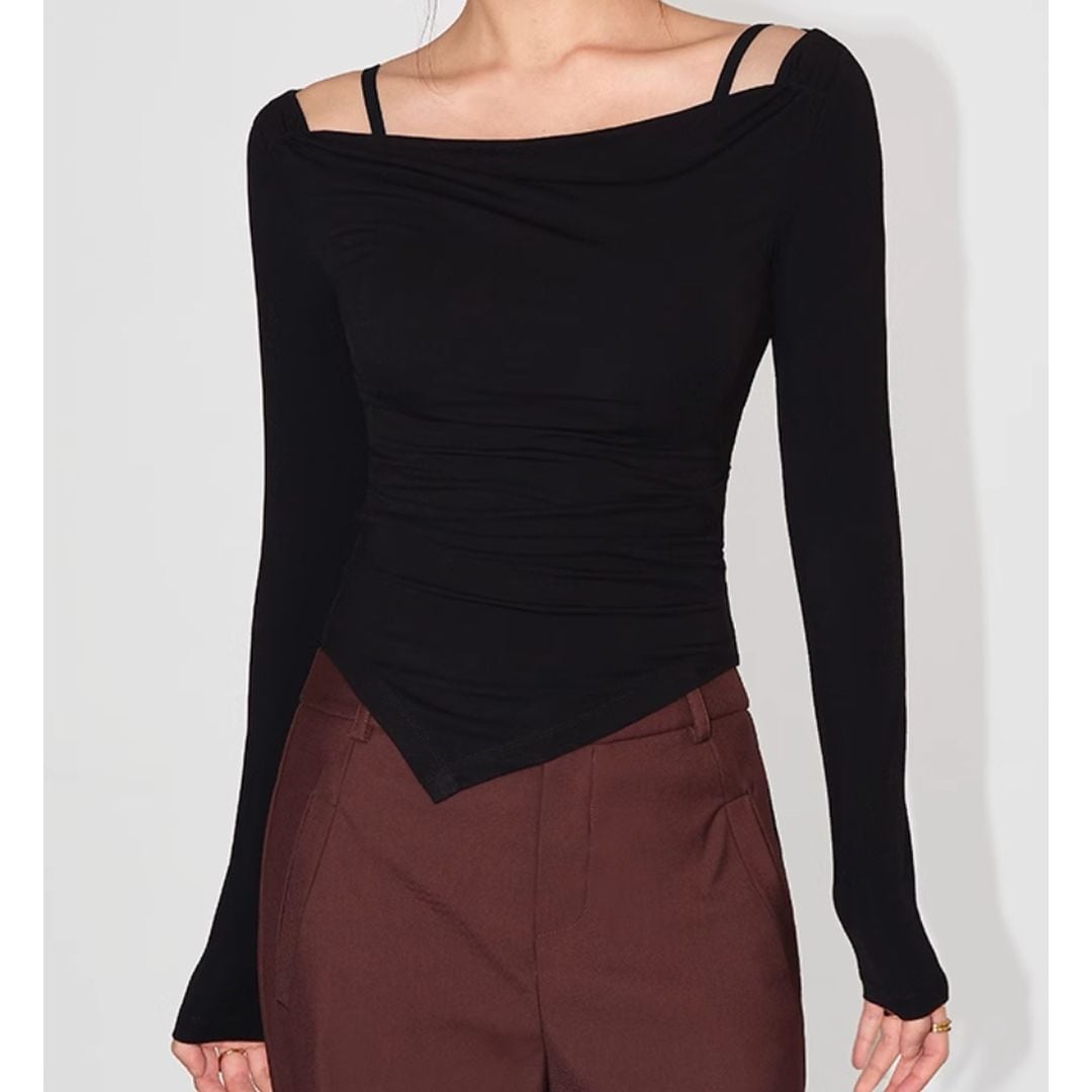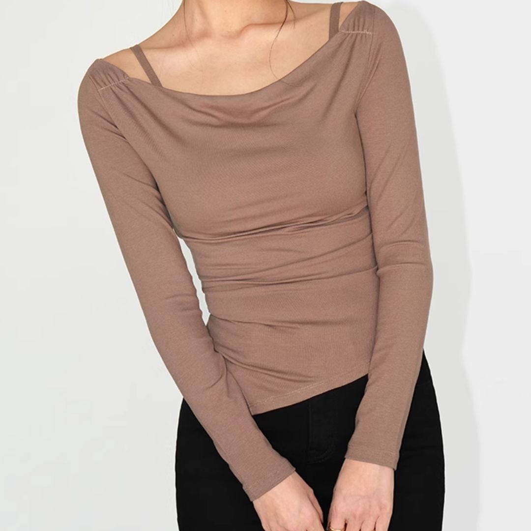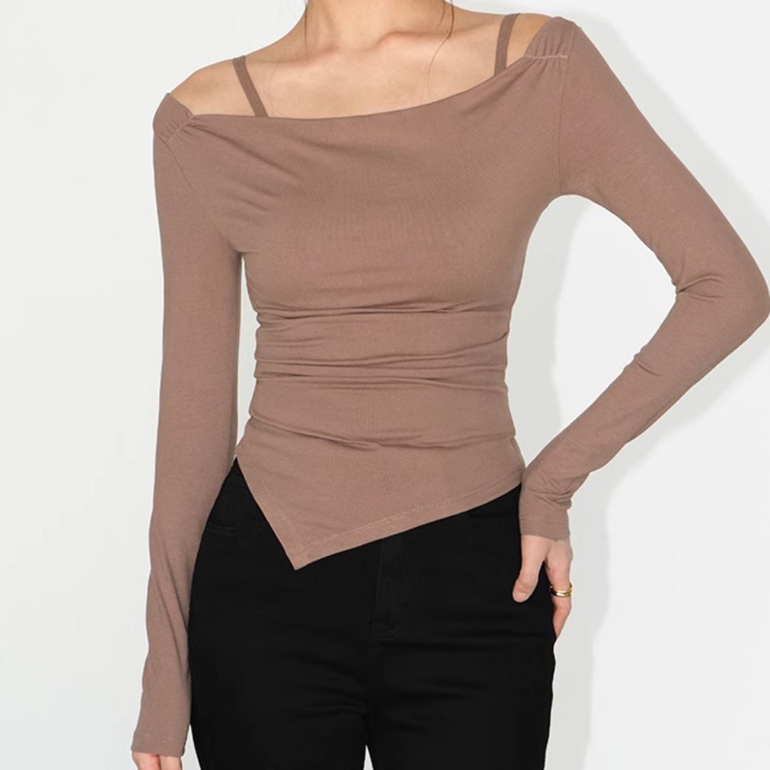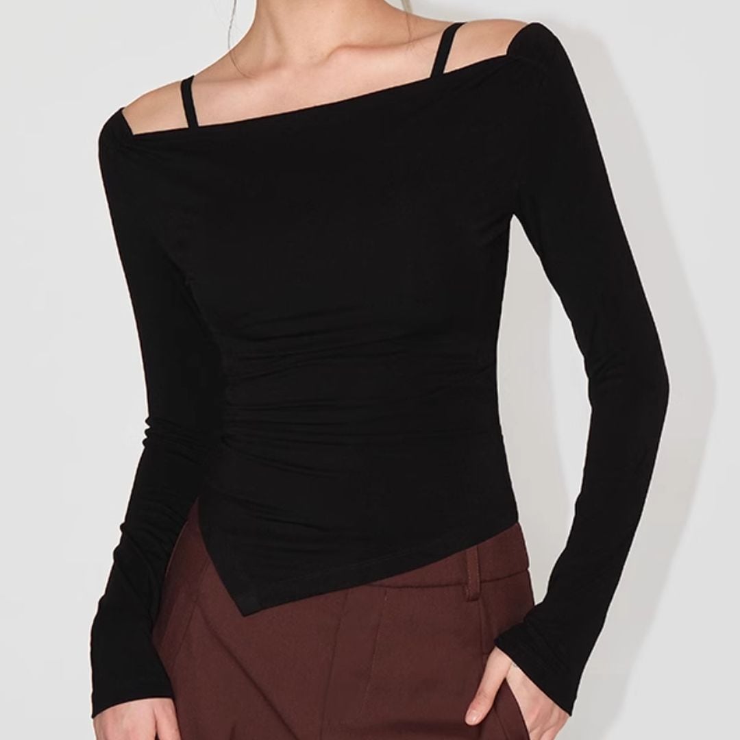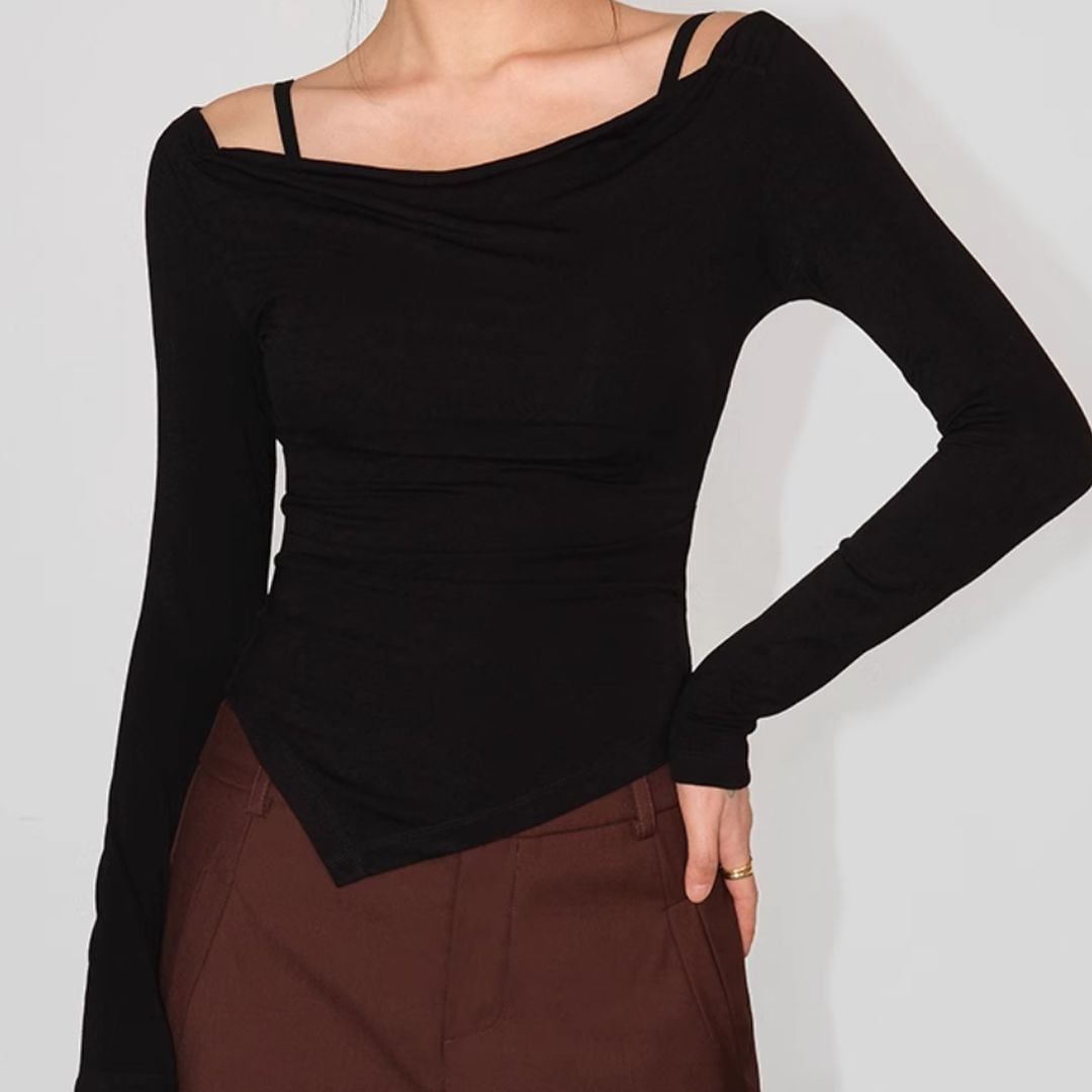 オフショルダーデザインとロングスリーブが織りなす、洗練されたタイトシルエットトップス。