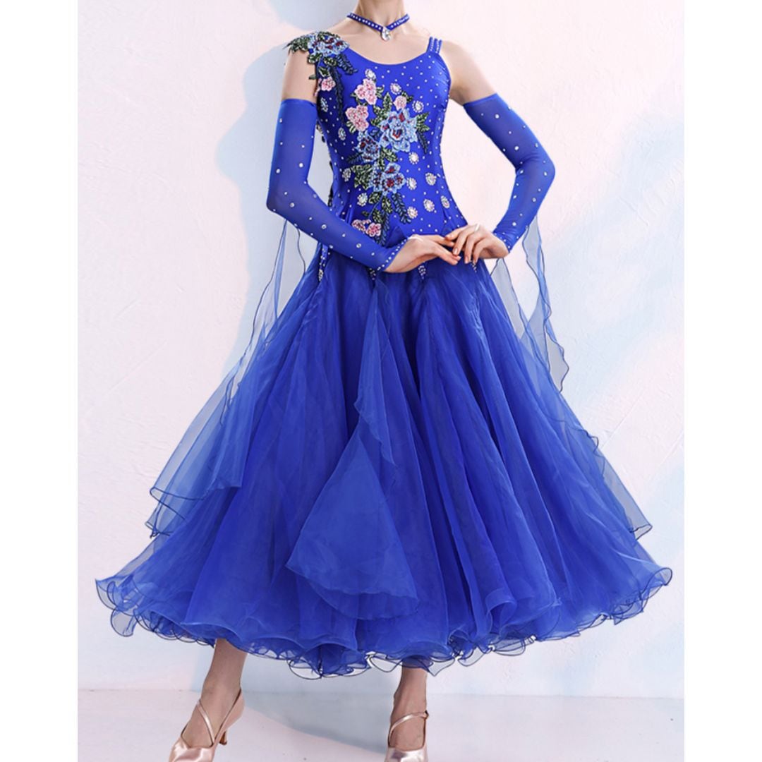 胸元から肩にかけてのフラワー刺繍と、繊細なラインストーンが輝きを添え、上品でエレガントな印象を与えます。