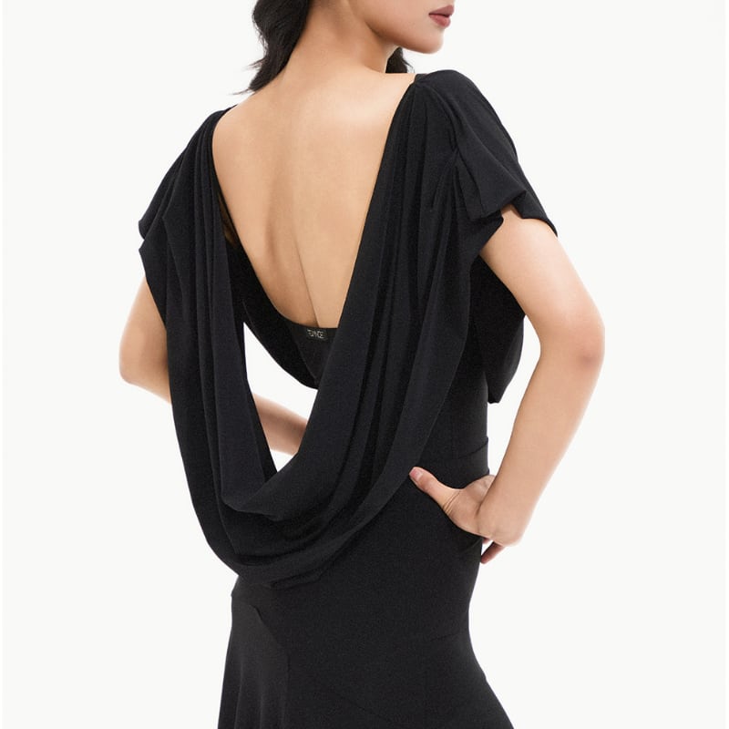 後ろ姿は深めのバックオープンで大胆なアクセントに。