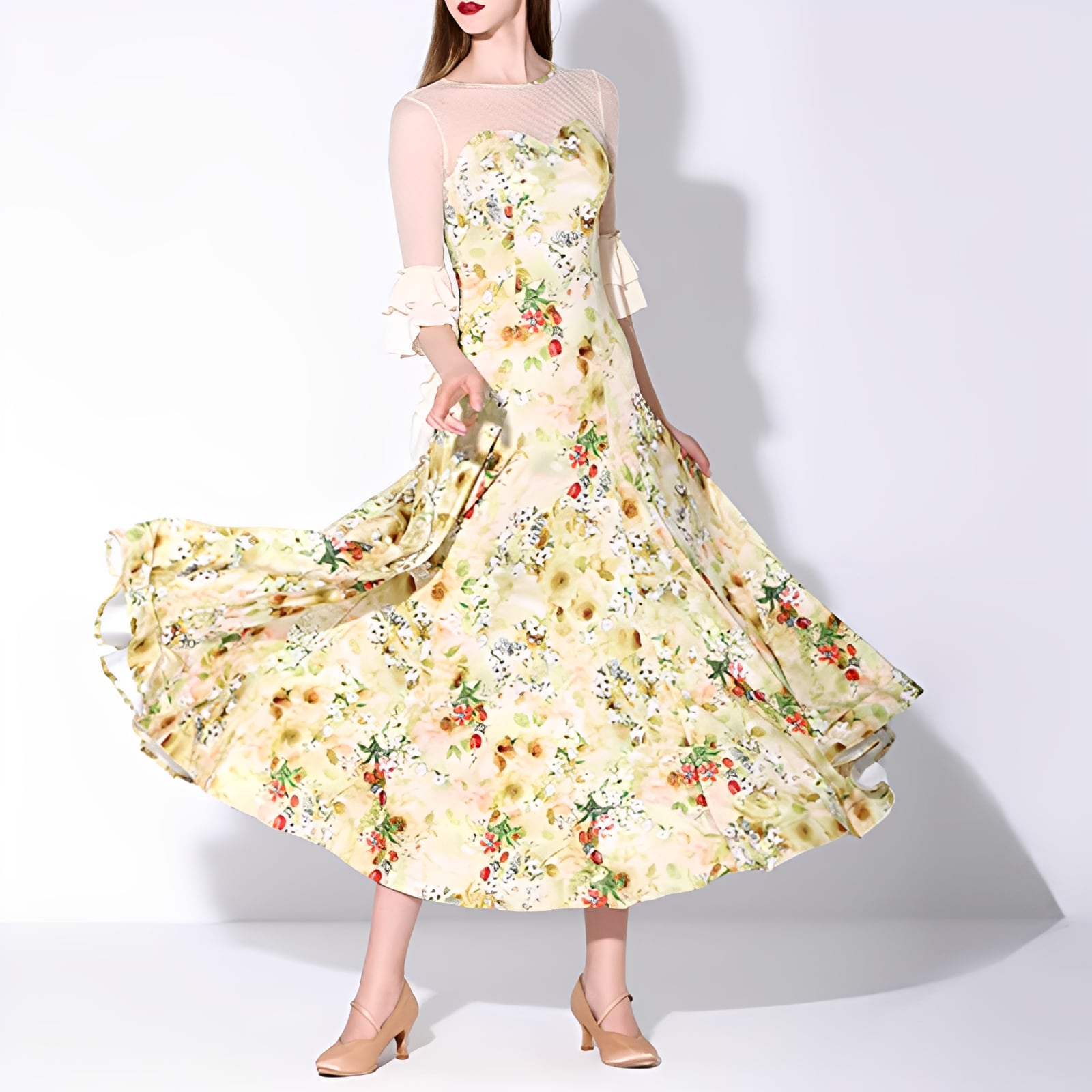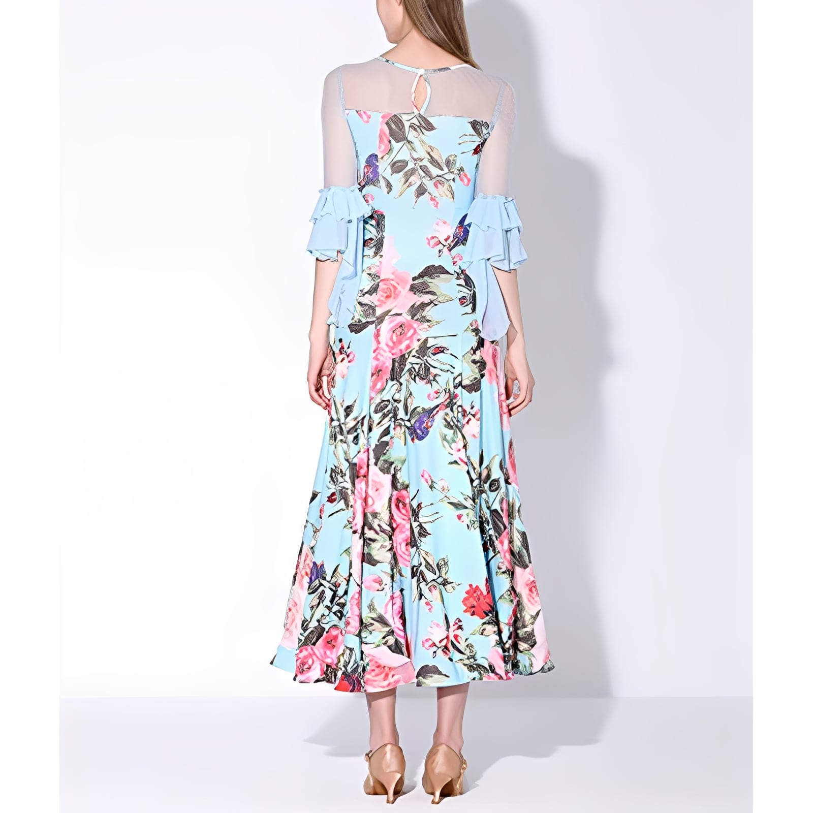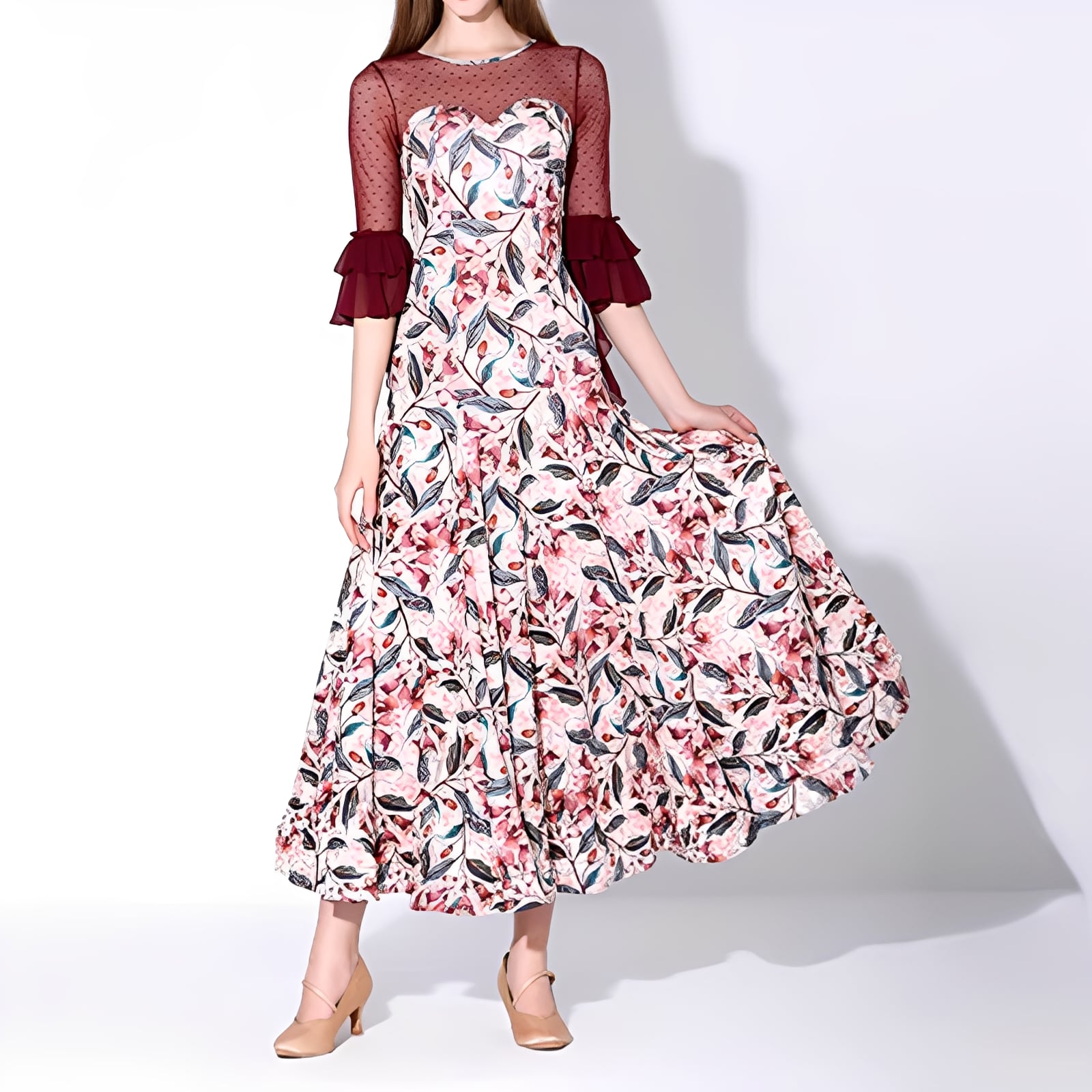 メッシュスリーブ エレガントフローラル フレア ダンスドレス 4col D00348