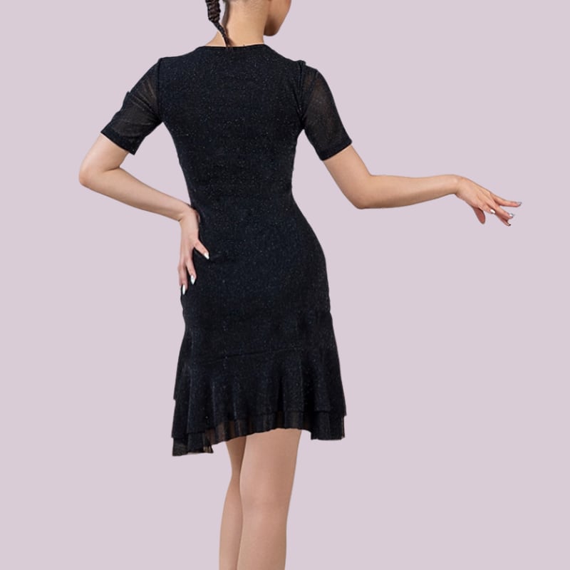 きらめくラメ素材が動くたびに光をまとい、華やかな存在感を放つダンスドレス。