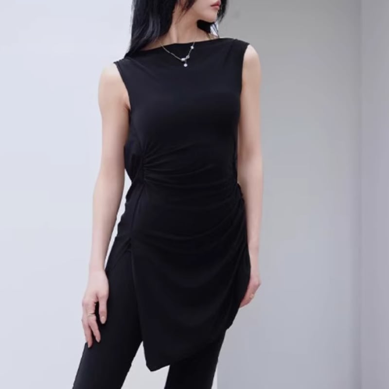裾部分のアシンメトリーデザインが目を惹く、ノースリーブトップス。