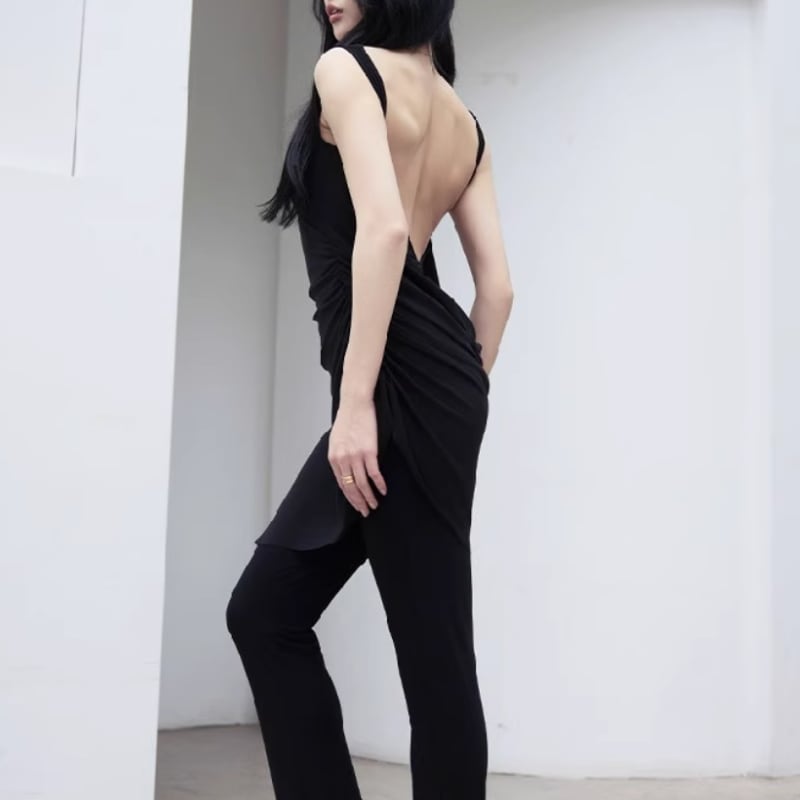 シンプルながらもサイド部分のシャーリングや、背中を美しく魅せるV字カットデザインで個性が光ります。