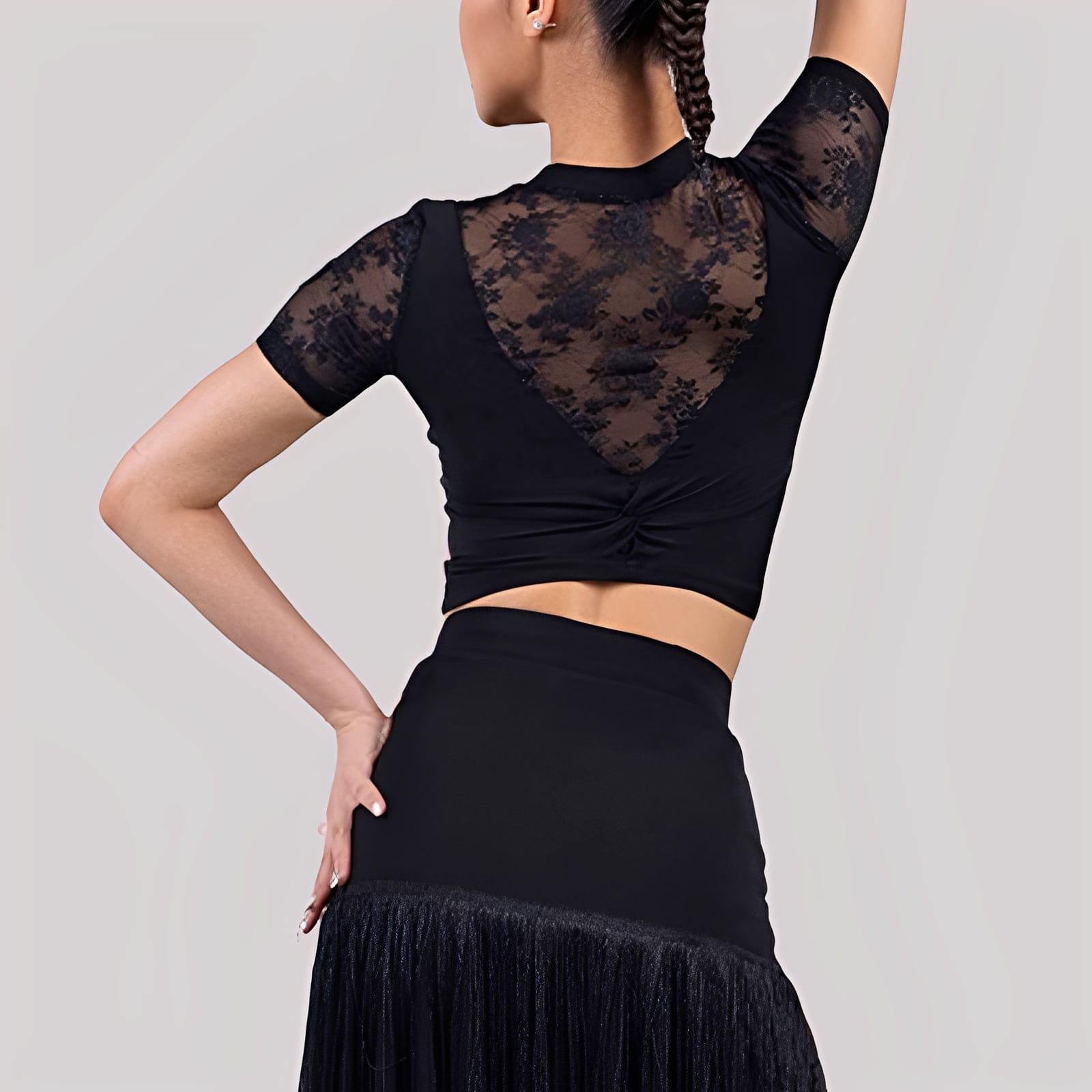 ハイネックとショートスリーブが洗練された印象を与えるショート丈トップス。