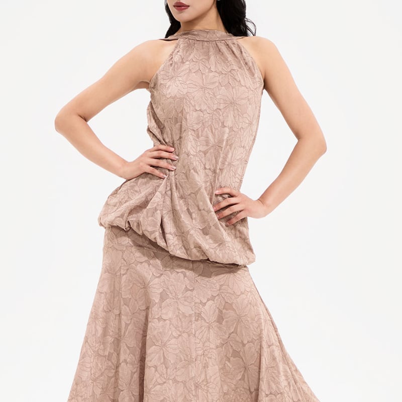 ハイネックとバックオープンが織りなす、洗練されたコントラスト。