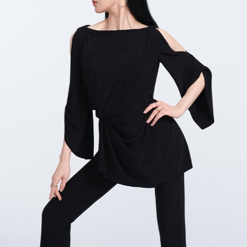 なめらかなドレープとオープンショルダーが特徴の、スタイリッシュトップス。