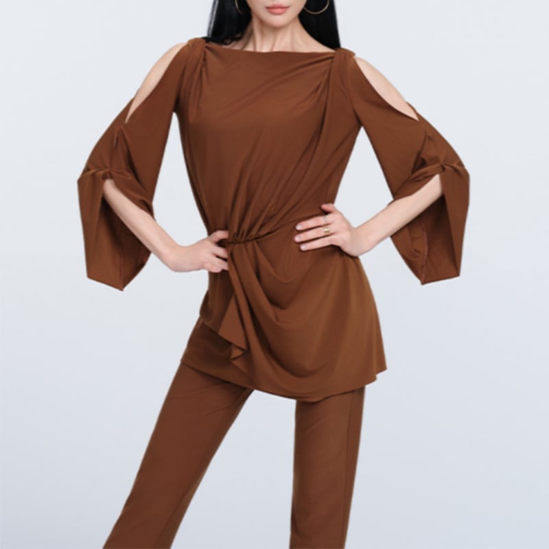 腕の動きに合わせて優雅に揺れる、ゆったりとしたドルマンスリーブが、大人の余裕を感じさせます。