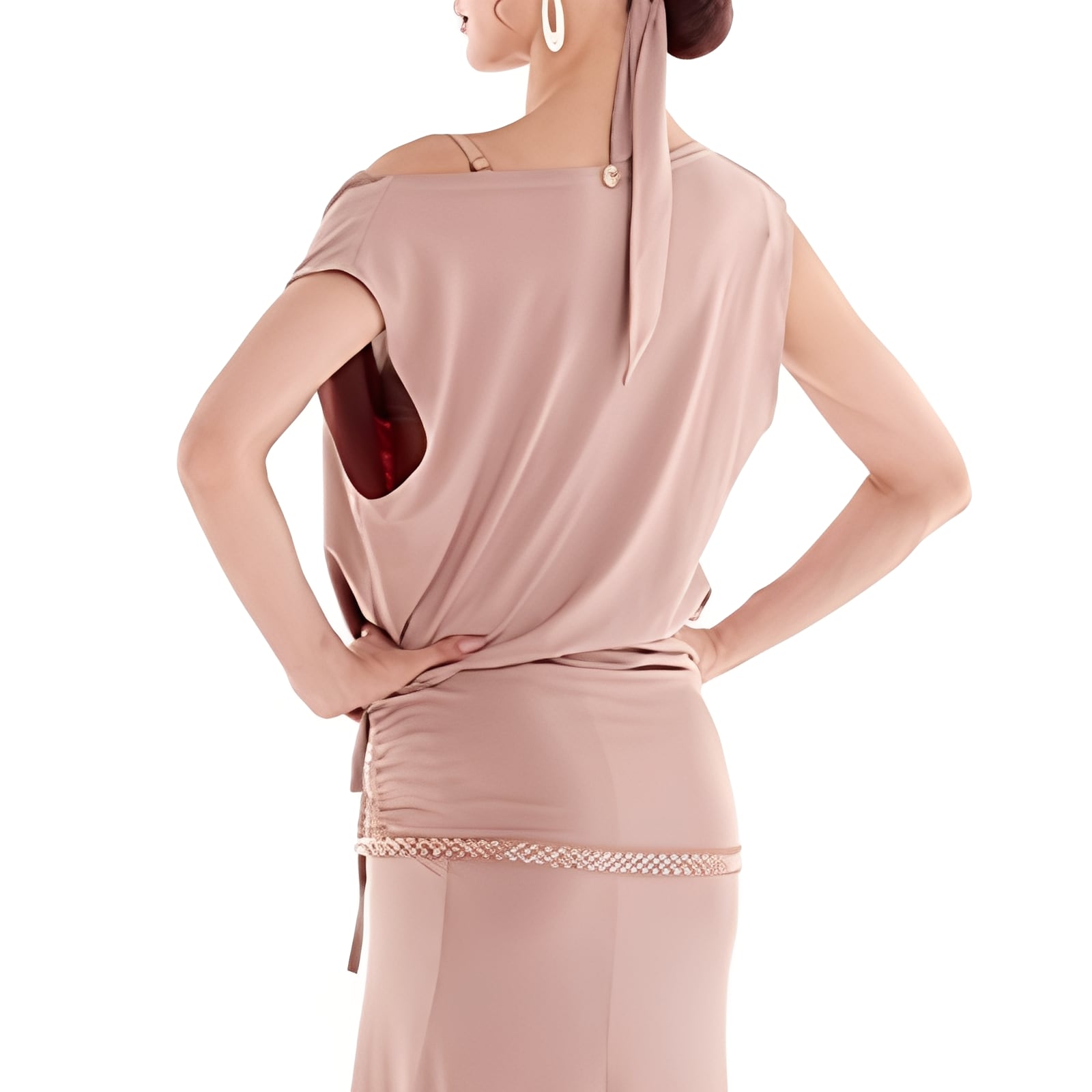 ヌーディーカラーと、ボディラインに沿う優美なドレープが印象的なドレス。