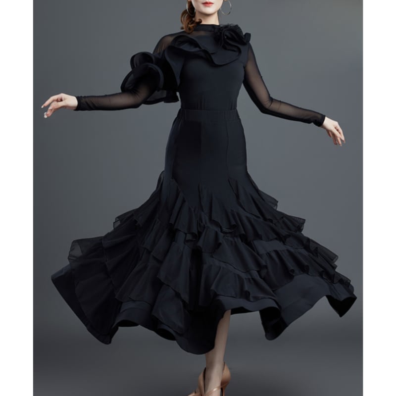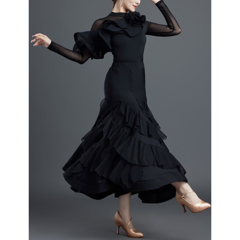 デコルテに大胆なフリルが視線を集める、モダンなデザインのレオタードトップス。