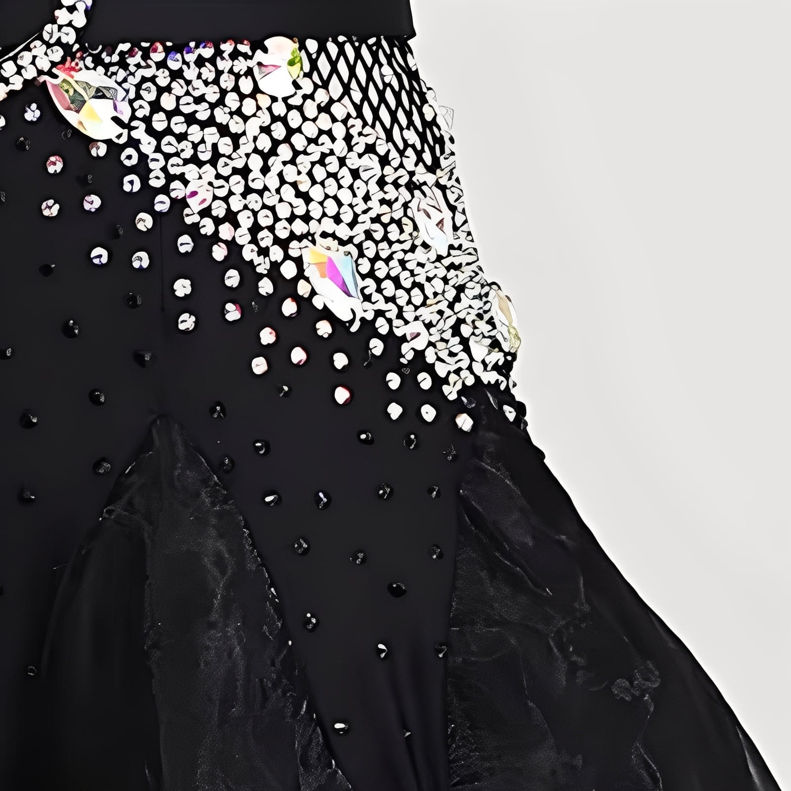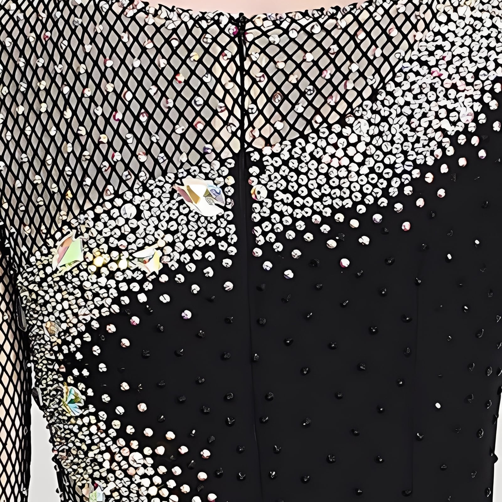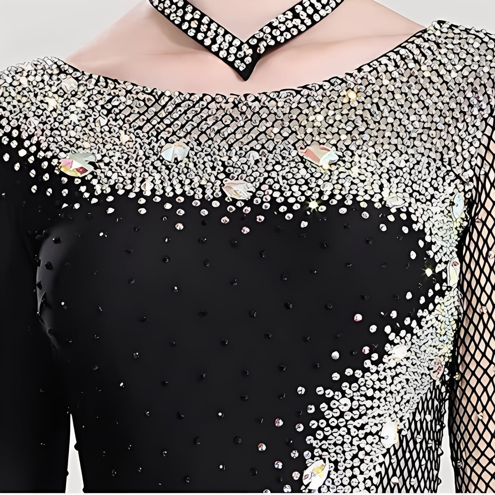 上半身全体にラインストーンが豪華にあしらわれ、フロアで眩い輝きを放つ、漆黒のモダンドレス。