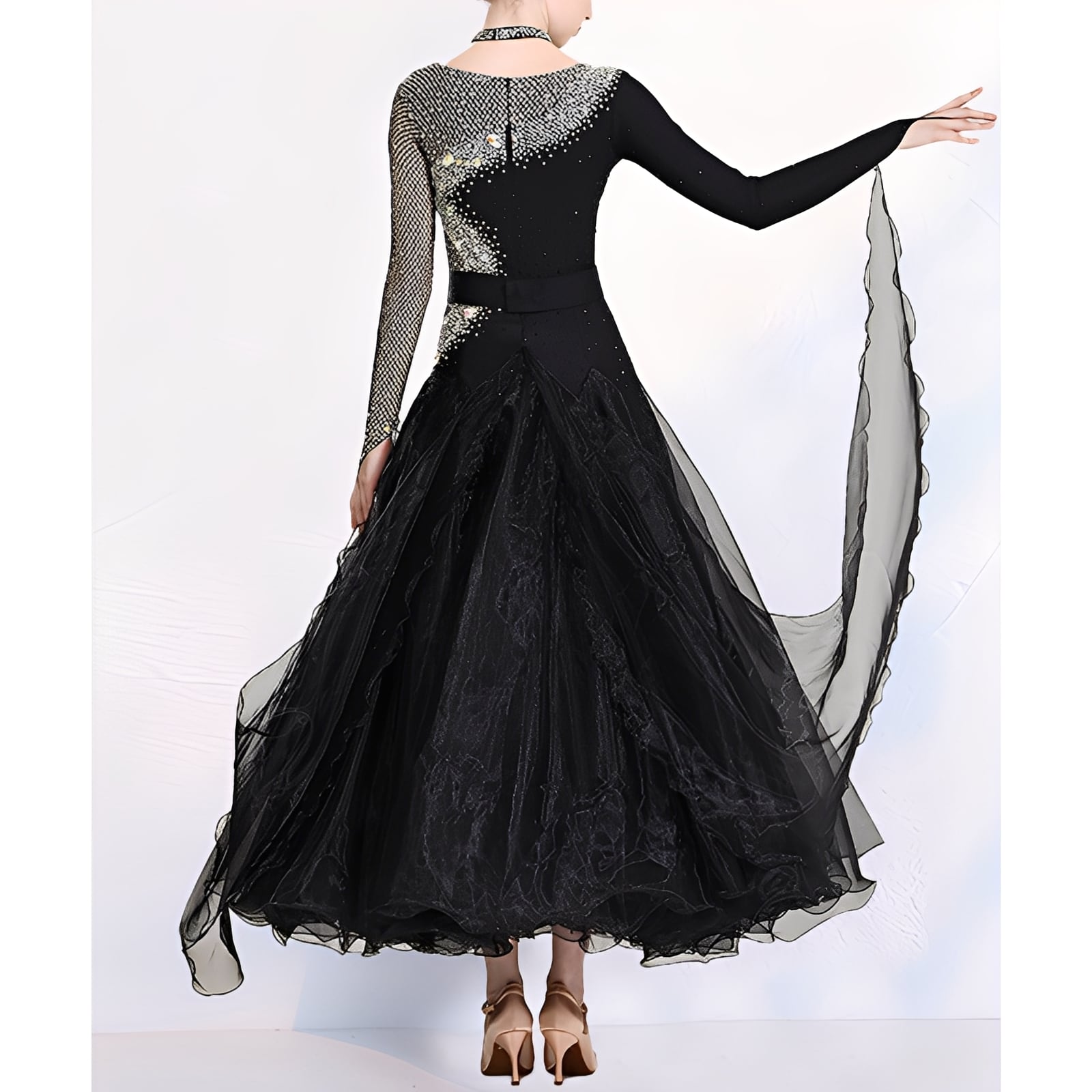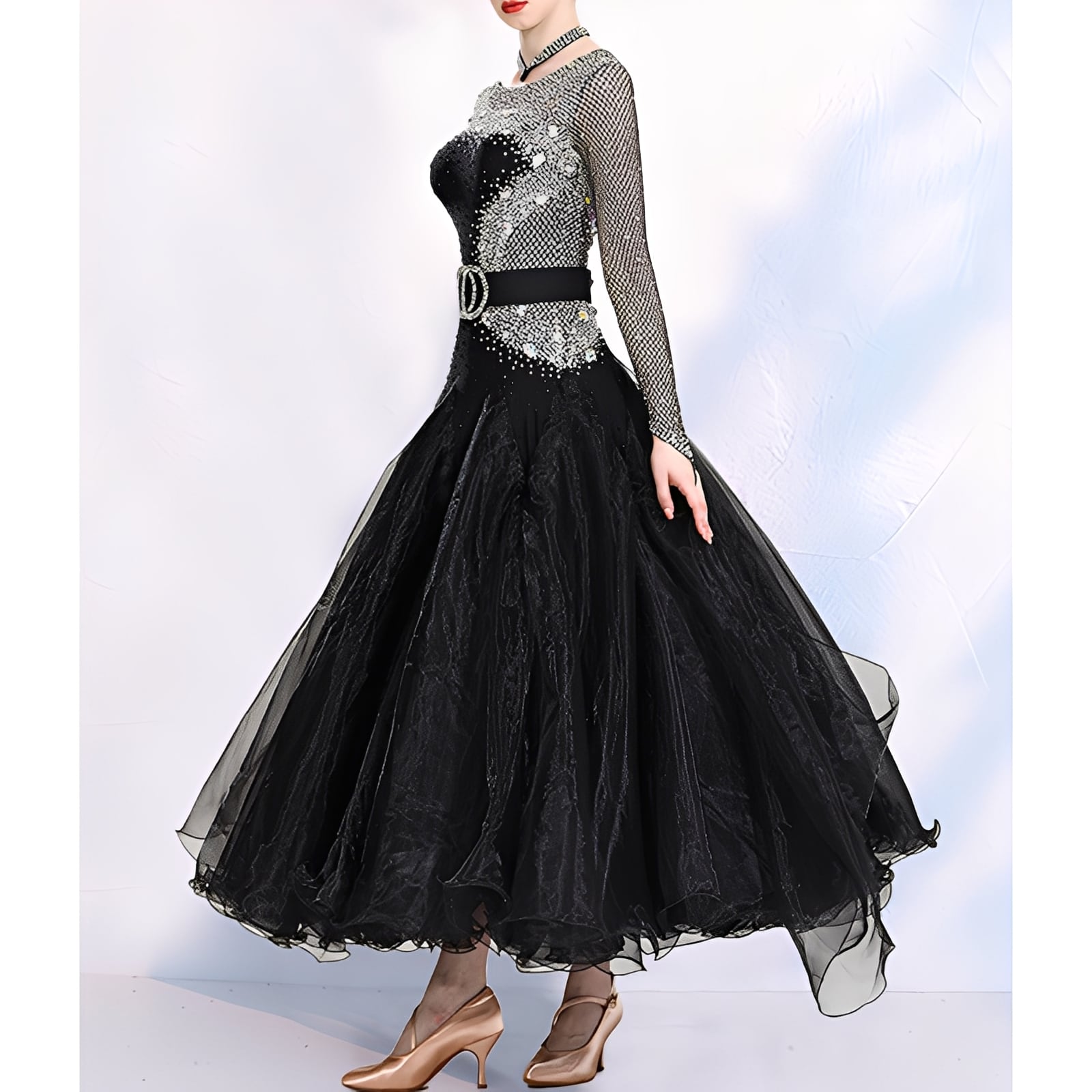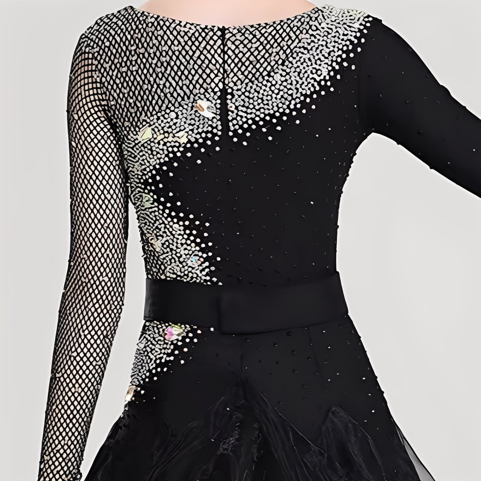 上半身全体にラインストーンが豪華にあしらわれ、フロアで眩い輝きを放つ、漆黒のモダンドレス。