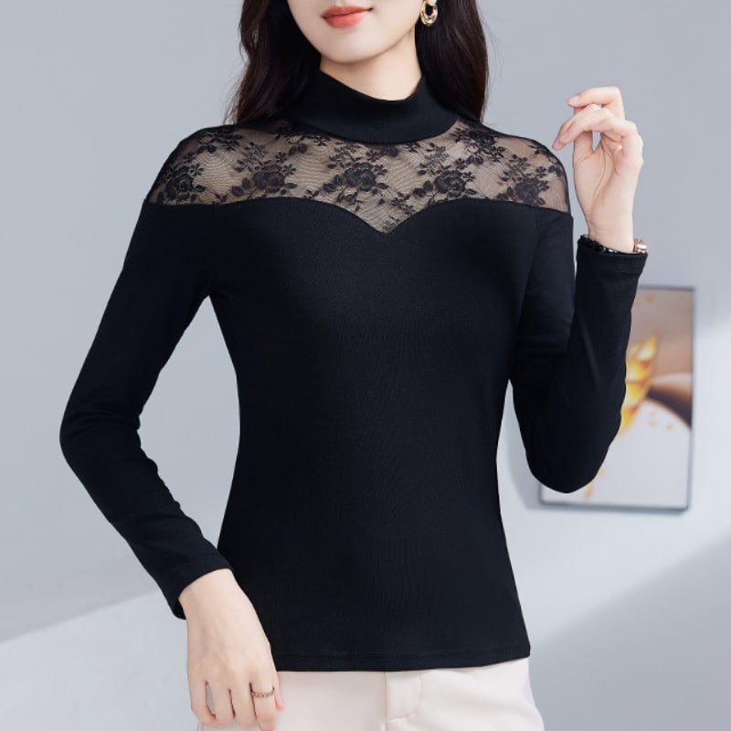 デコルテ部分の繊細なフローラルレースが、上品な肌見せを叶えるモックネックトップス。胸元のV字カッティングと透け感のあるシースルーが、顔周りを華やかに、そして小顔に見せる効果を演出します。