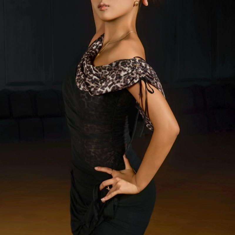 オフショルダーと、透け感のあるメッシュ素材を組み合わせた、レオタードトップス。