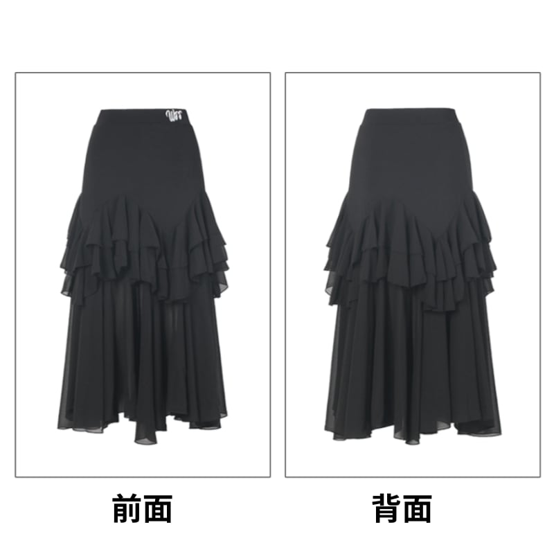 V字 ラッフル ティアード シフォン ロングフレアスカート 1col D00434