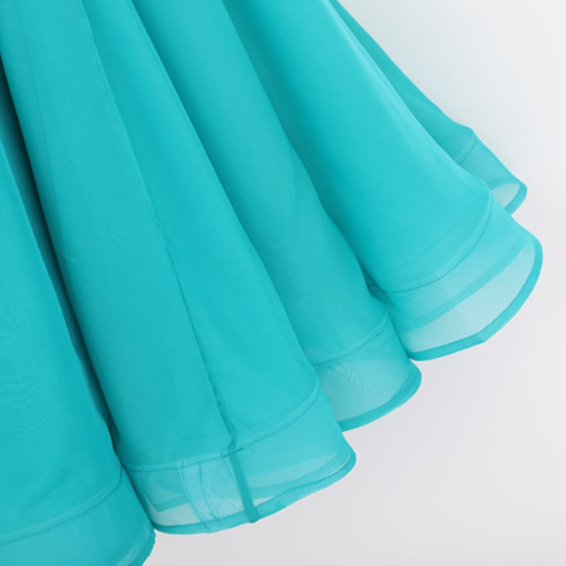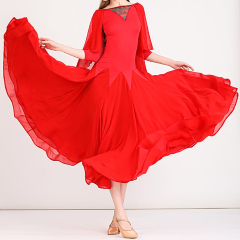 胸元のVネックと、裾に向かって広がるプロ仕様のフレアが、抜群のスタイルアップ効果を実現。