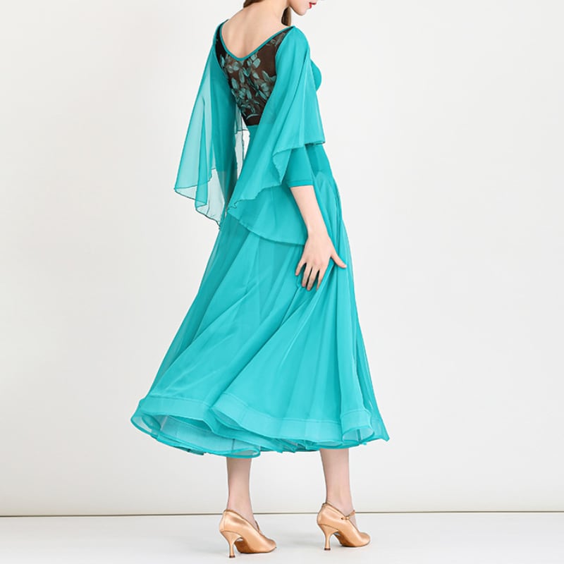 袖に流れるようなケープスリーブを配し、腕の動きに優雅な余韻をプラスします。