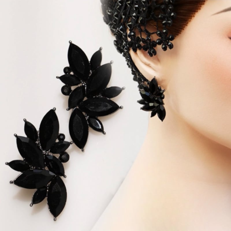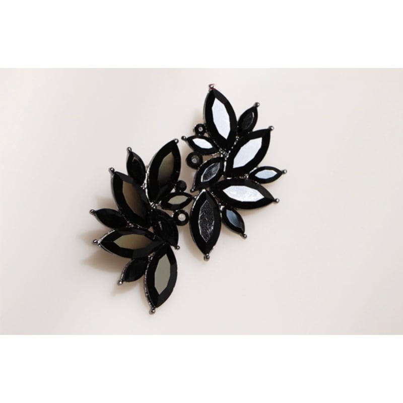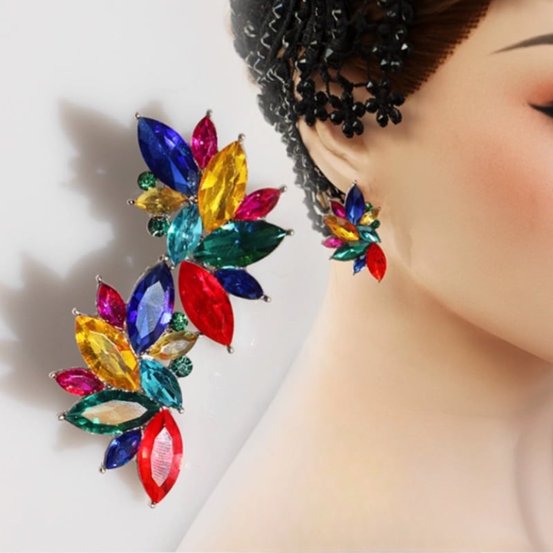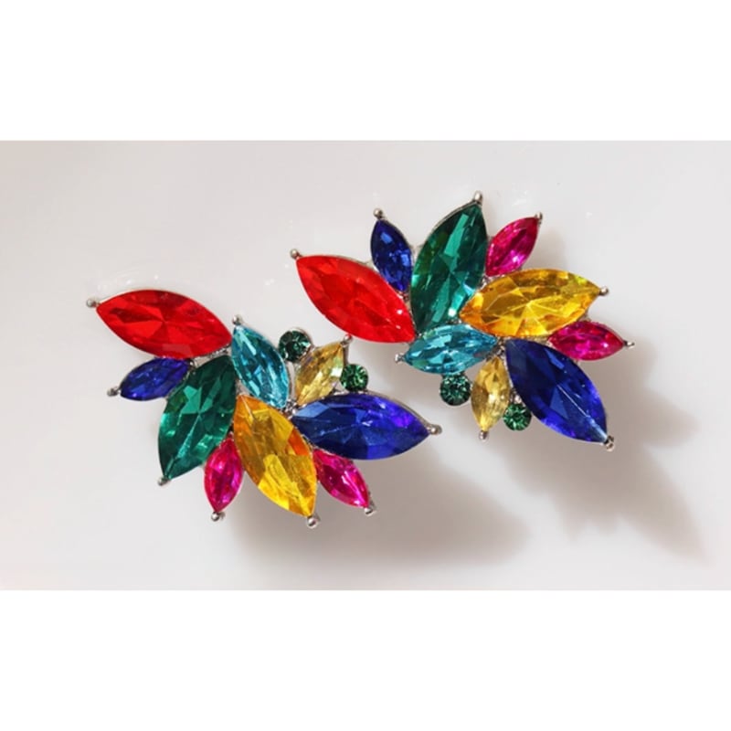 様々な色と形のラインストーンを組み合わせ、立体的なフラワーモチーフを描いたゴージャスなアクセサリー。