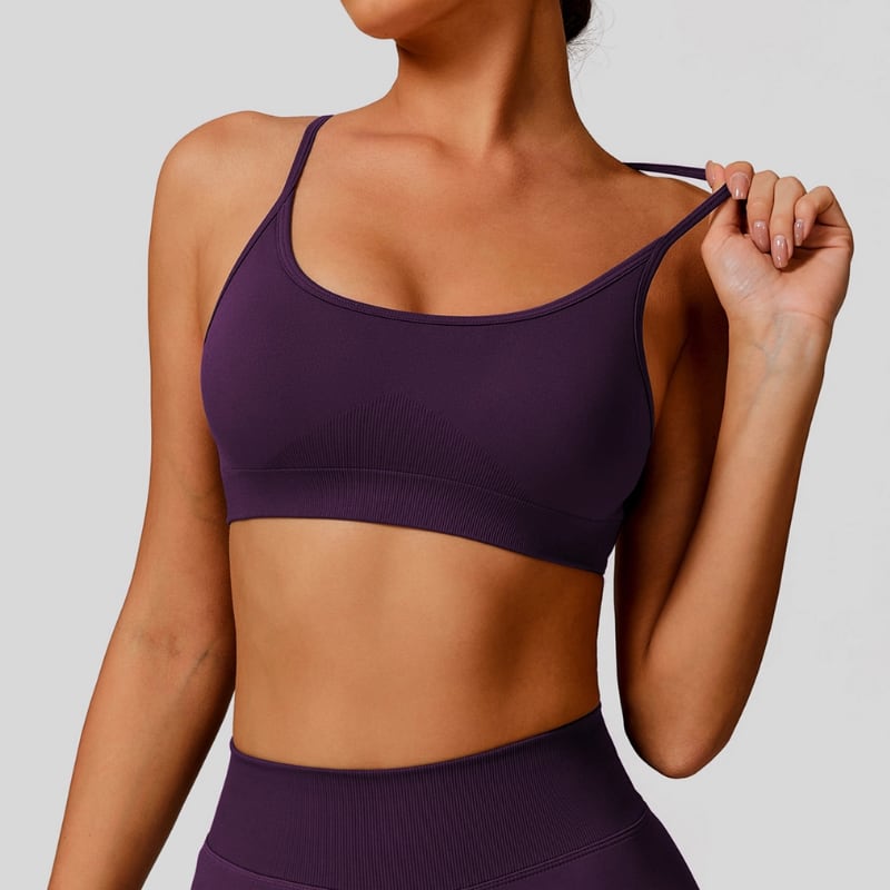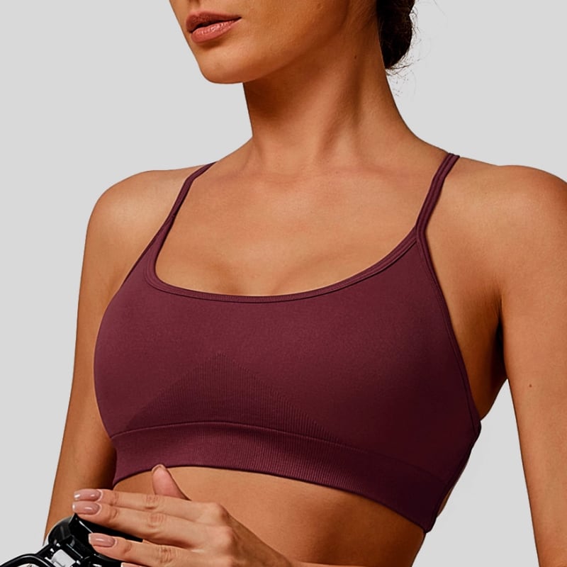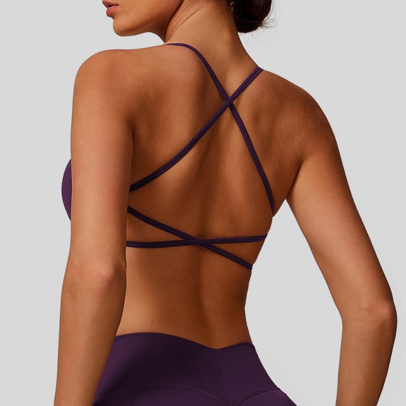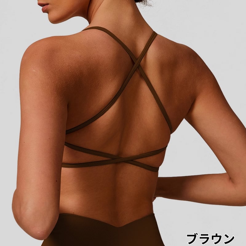 背中のラインを究極に美しく見せる、繊細なクロスストラップデザインが特徴のブラトップ。