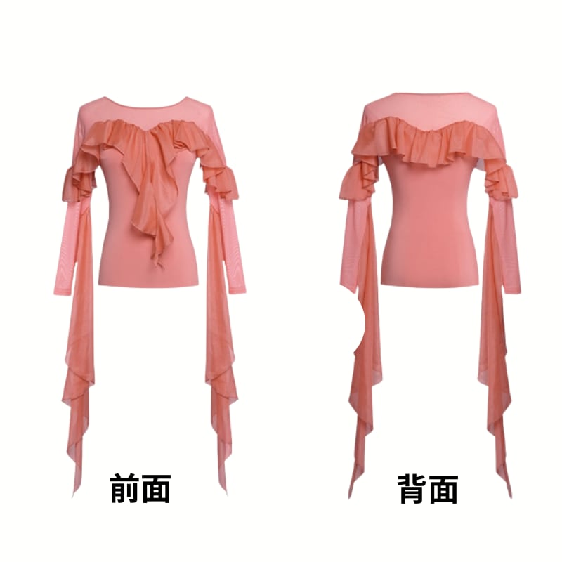 肩から胸元にかけて流れるアシンメトリーなフリルと、シアー素材のロングドレープが目を引くトップス。