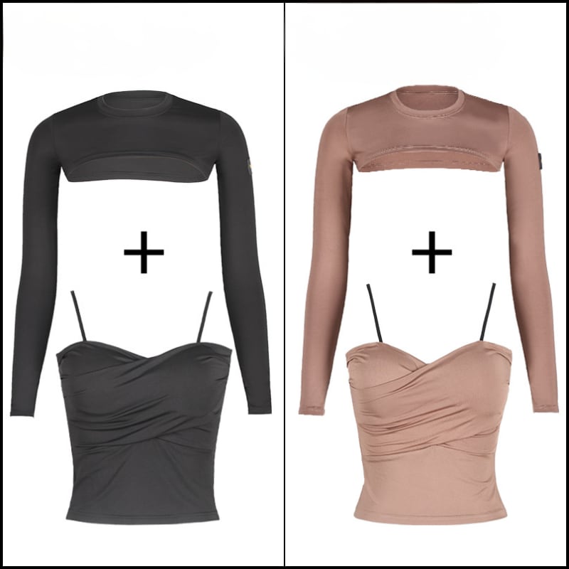 セクシーな肌見せを叶える、カットアウトデザインの長袖ボレロとギャザーキャミソールのレイヤードセット。
