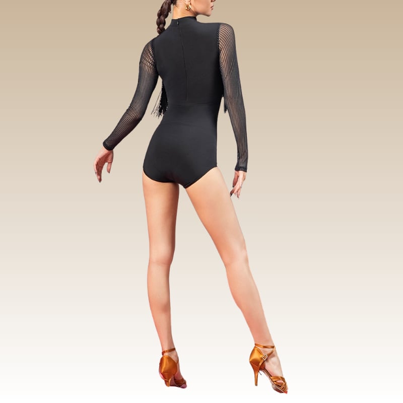 シースルー素材が腕のラインを繊細に描き出し、胸元から腰にかけてのフリンジが激しい動きに追従し、情熱的なムードを盛り上げます。