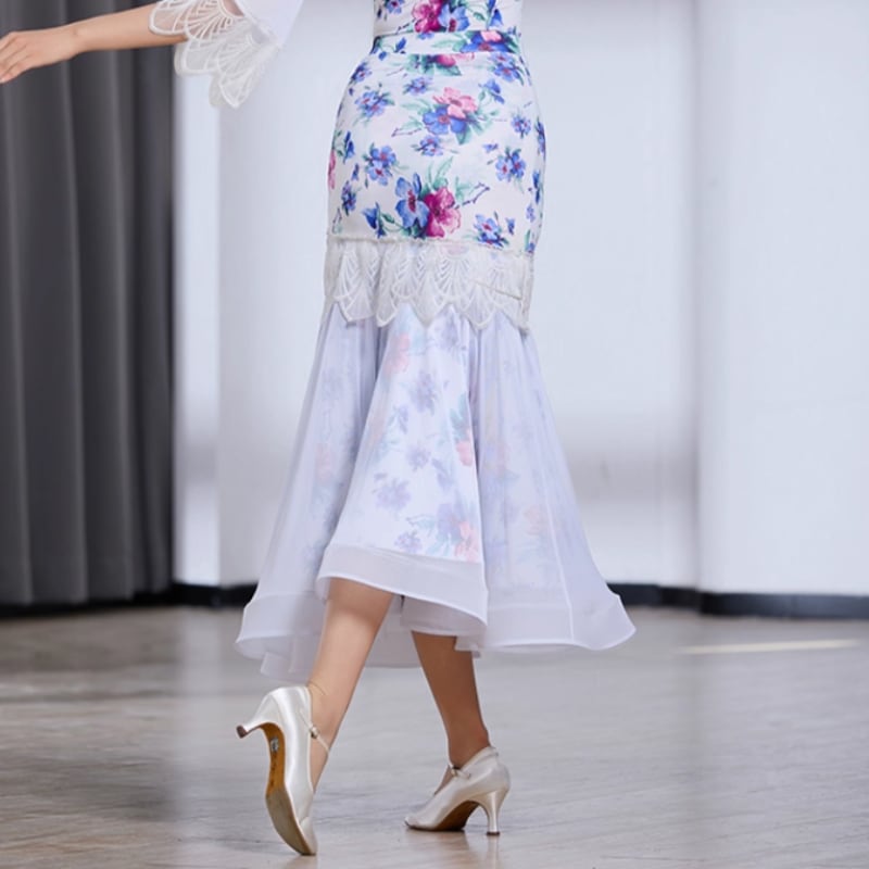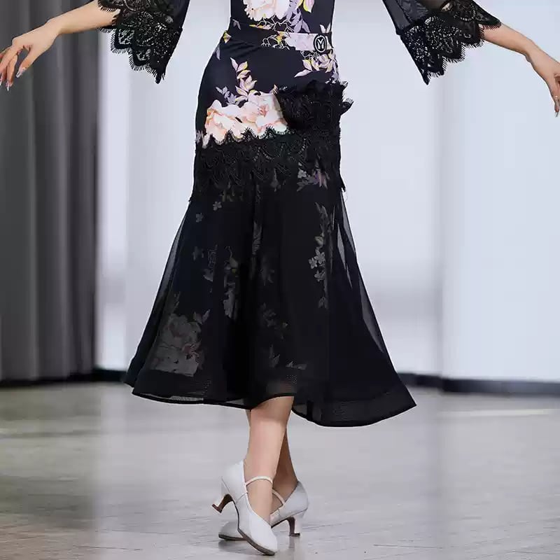 裾周りに描かれた繊細なフローラルプリントと、シックなレースの切り替えがエレガントなロングスカート。