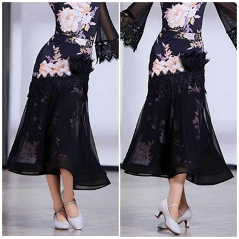 透け感のあるシースルー素材を使用し、動くたびに華やかなプリントとレースが優美な陰影を作り出します。