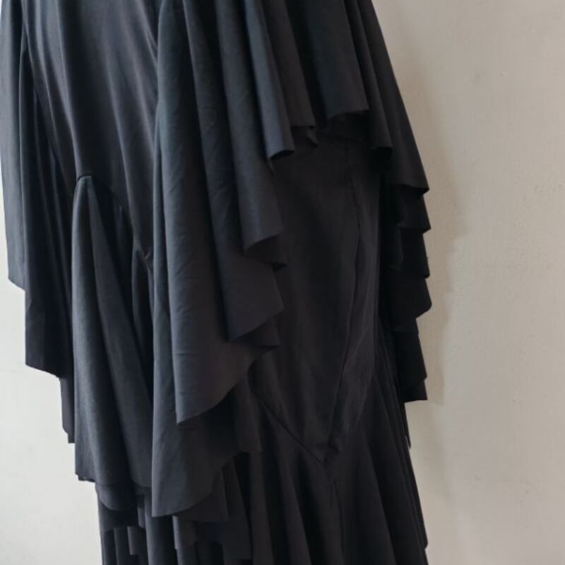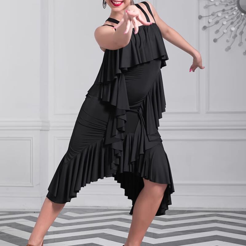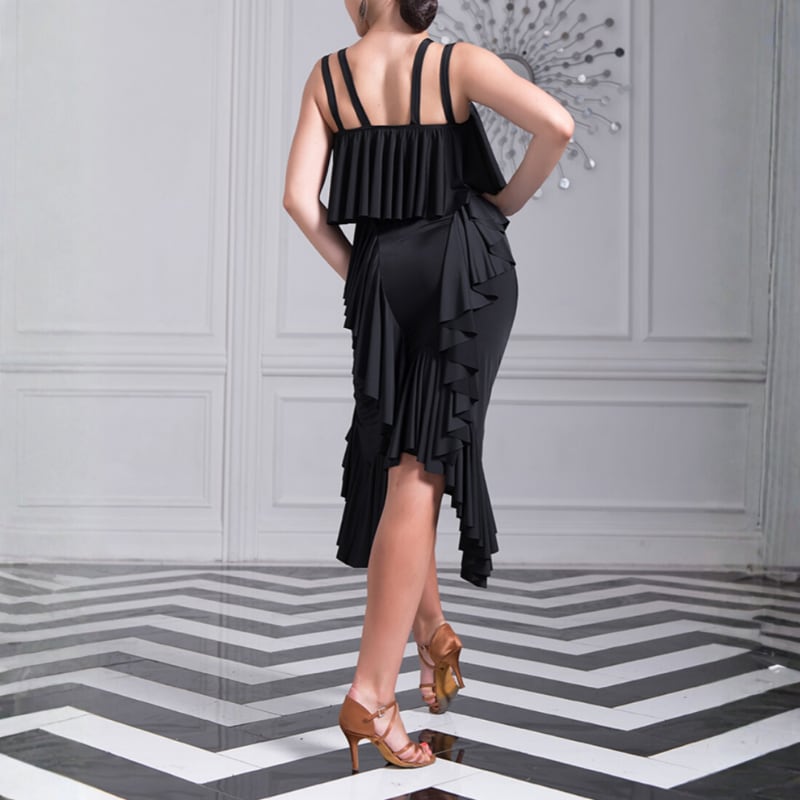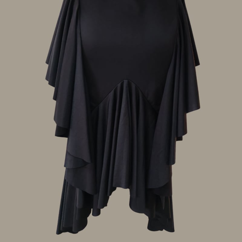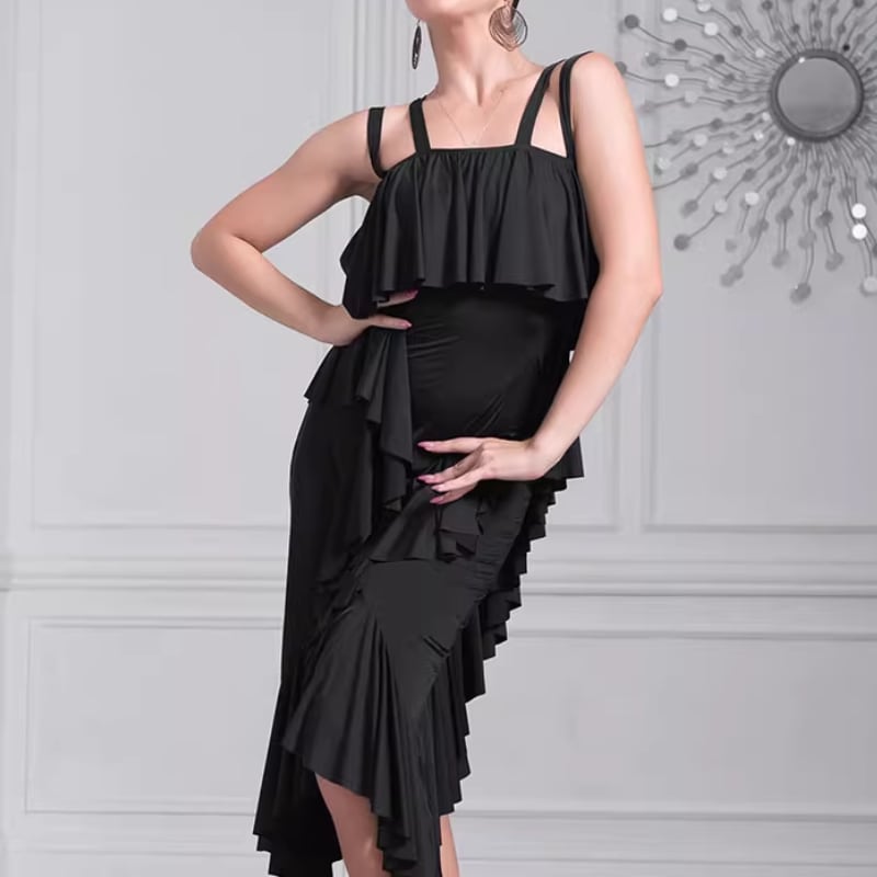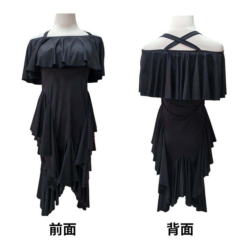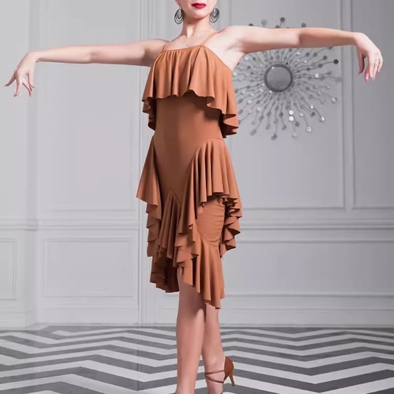 幾重にも重ねられたラッフルフリルが、軽快かつ情熱的な動きを演出するラテンドレス。