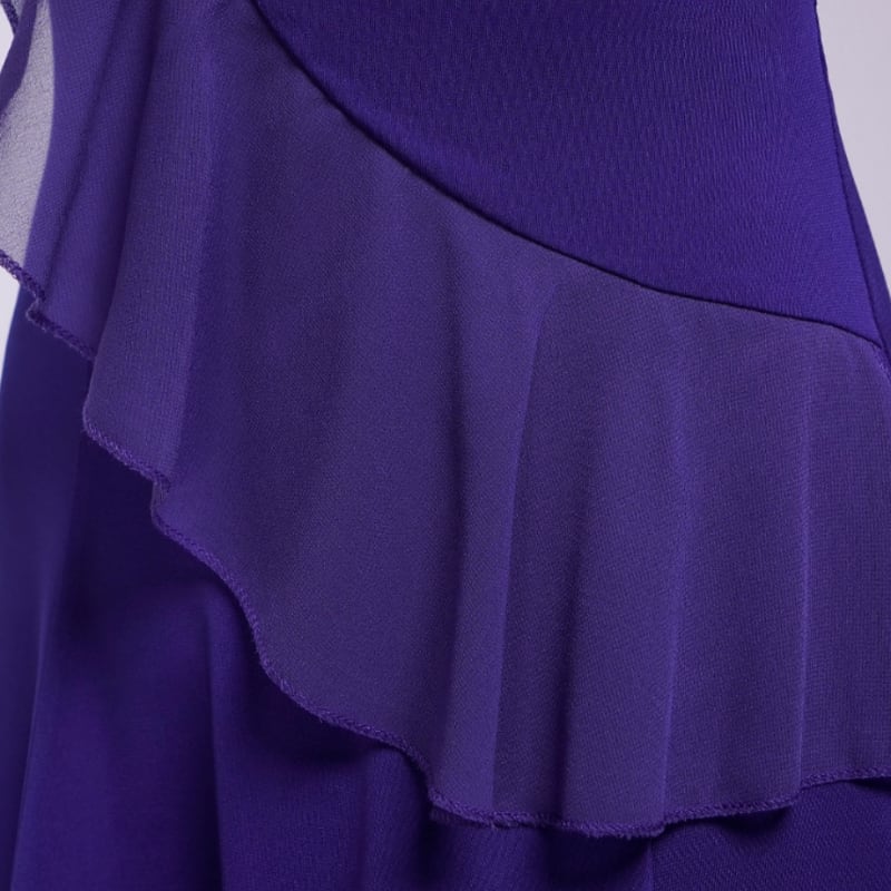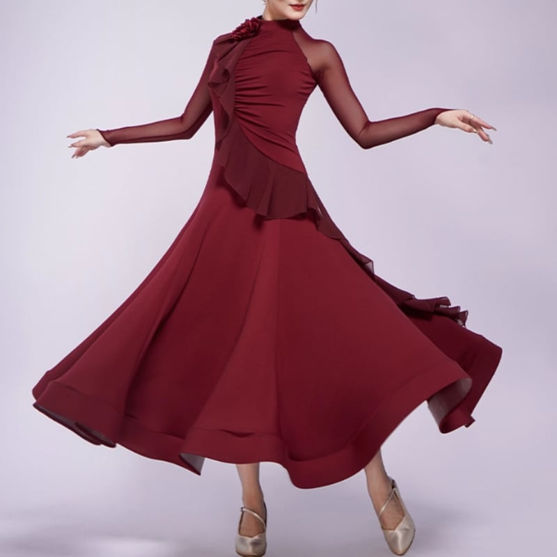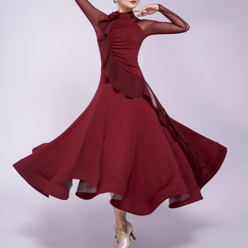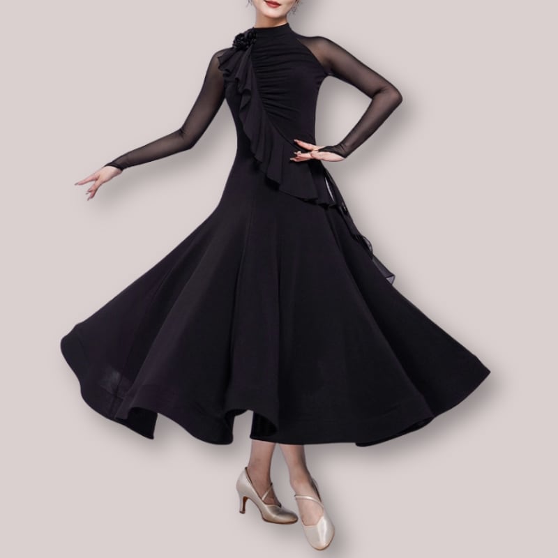胸元からウエストにかけての斜めのフリル装飾が縦のラインを強調し、スタイルアップ効果抜群です。 大きく広がるスカートは、フロアでの動きをドラマティックに演出し、「風を纏うような軽やかさ」で優雅なステップを支えます。