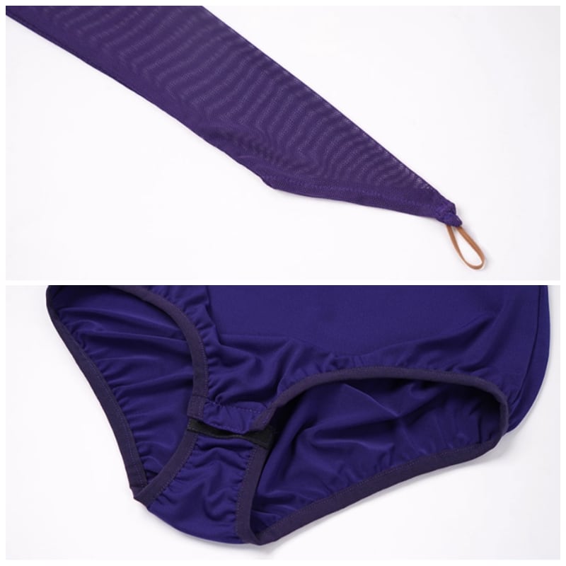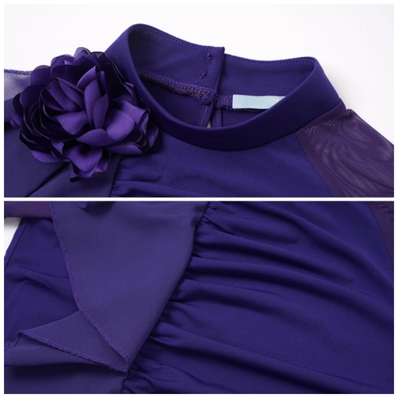 シースルーのメッシュスリーブとハイネックデザインが、首筋から指先までを長く優雅に見せます。