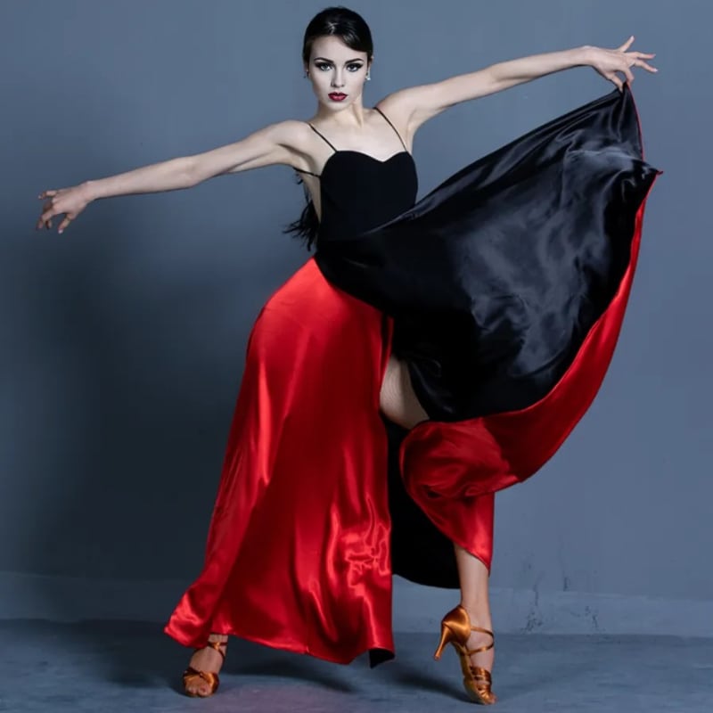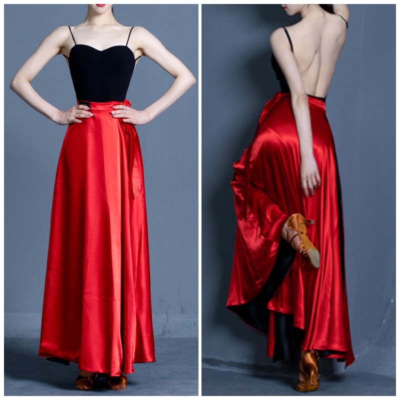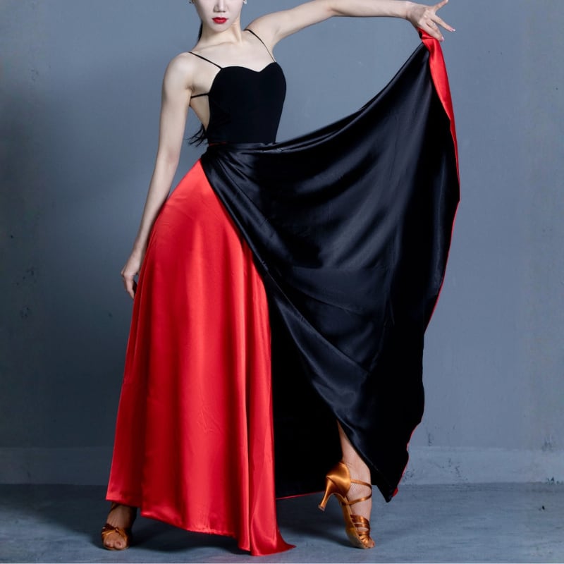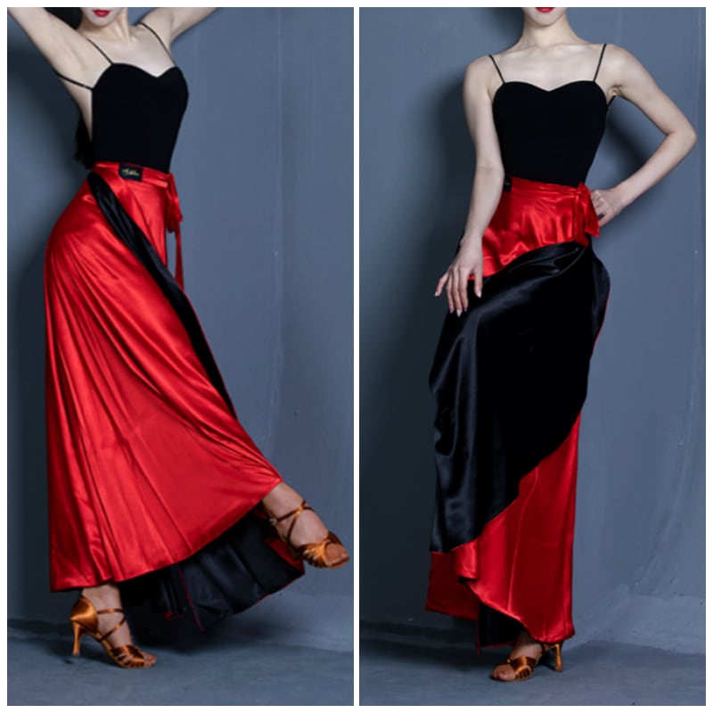 情熱的なレッドとシックなブラックのバイカラーが、ドラマティックなムードを演出するロングダンススカート。