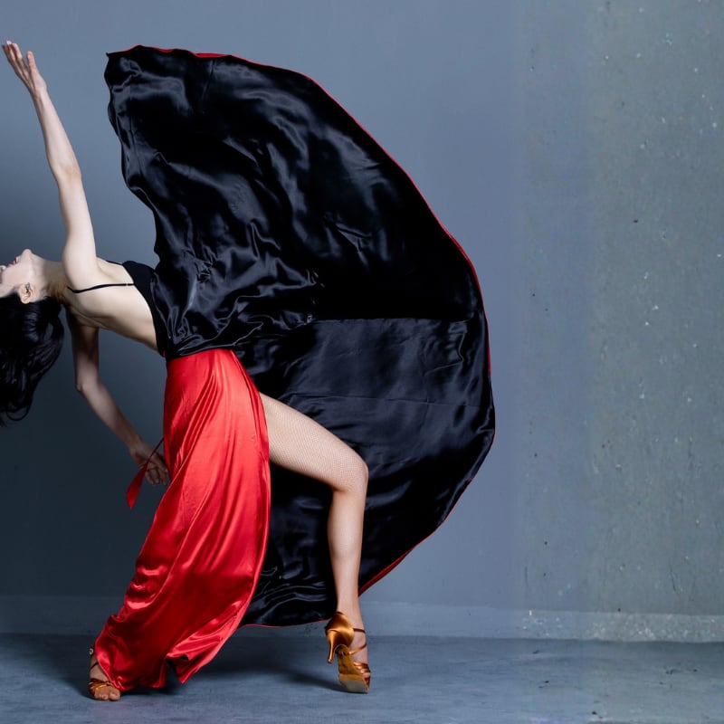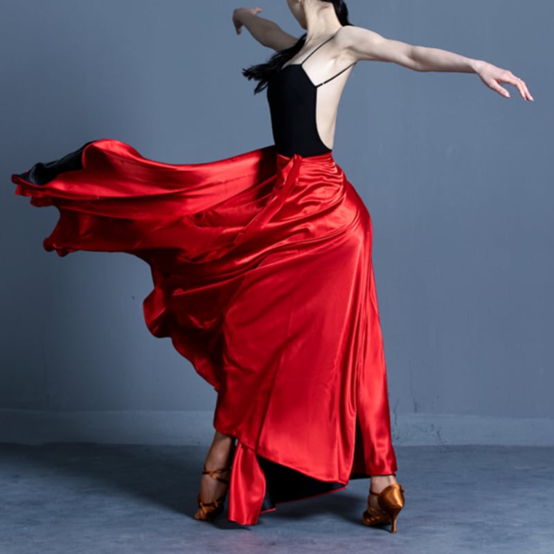 光沢感のある生地を使用し、フロアで踊るたびに流れるような美しいドレープと陰影を生み出します。 大胆なハイウエストと深いスリットが脚の動きを際立たせ、あなたの表現力を最大限に引き立てます。 タンゴやパソドブレなど、情熱的なダンスで圧倒的な存在感を放ち、観客の目を釘付けにしたいあなたへ。