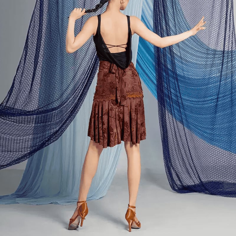 フロッキー加工されたベロアのフラワーモチーフが、エレガントな立体感を演出するラテンスカート。