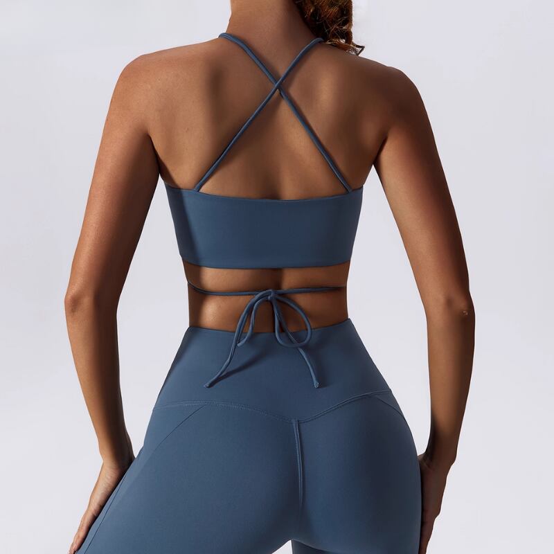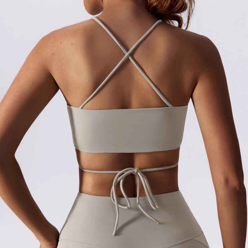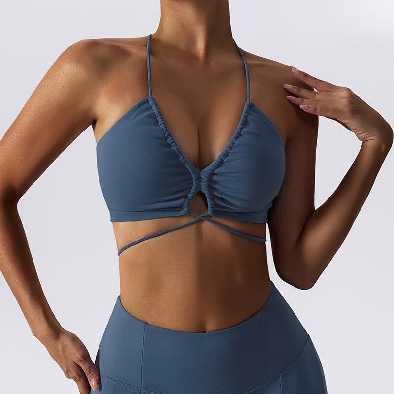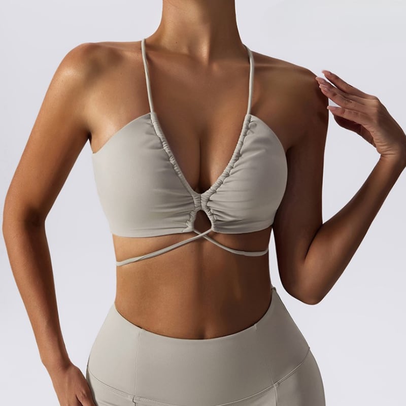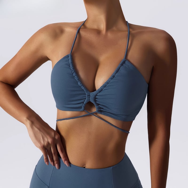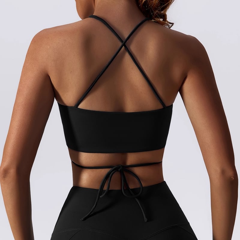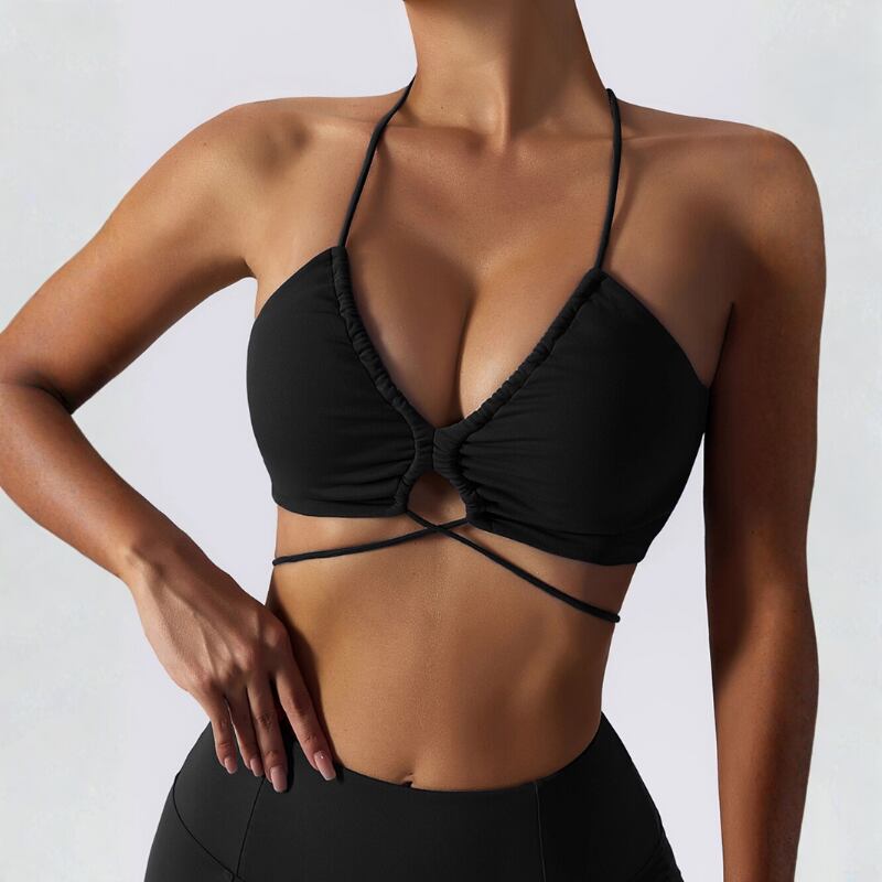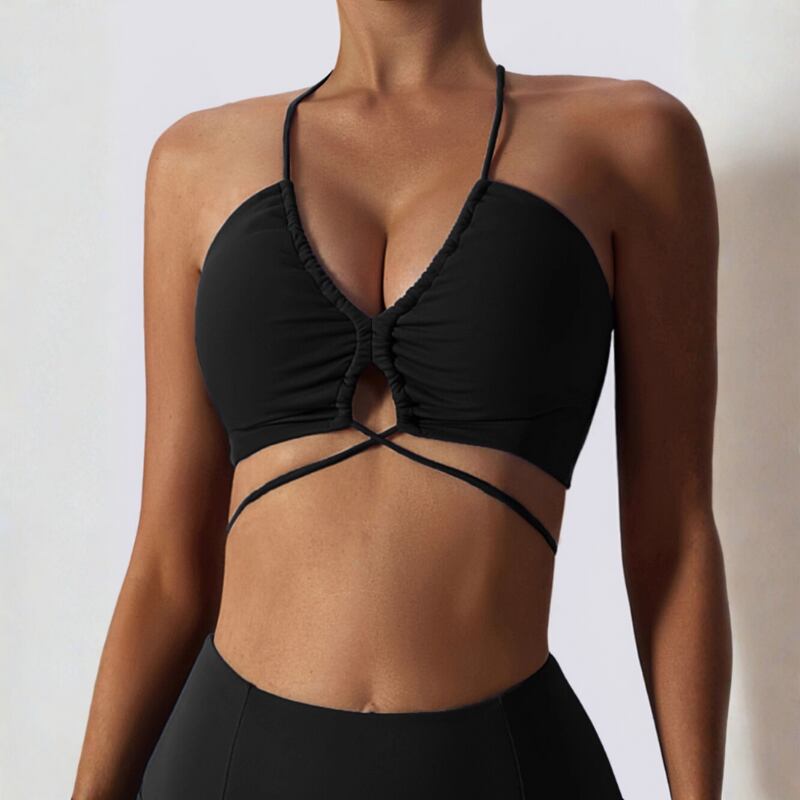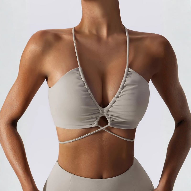 胸元とストラップのクロスデザインが、ヘルシーな色気を演出するホルターネックのブラトップ。