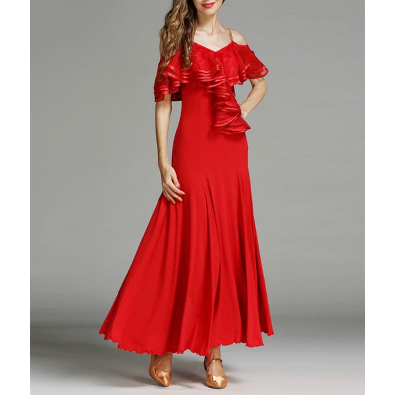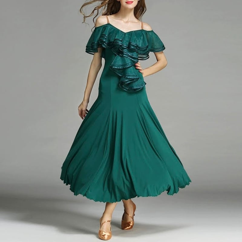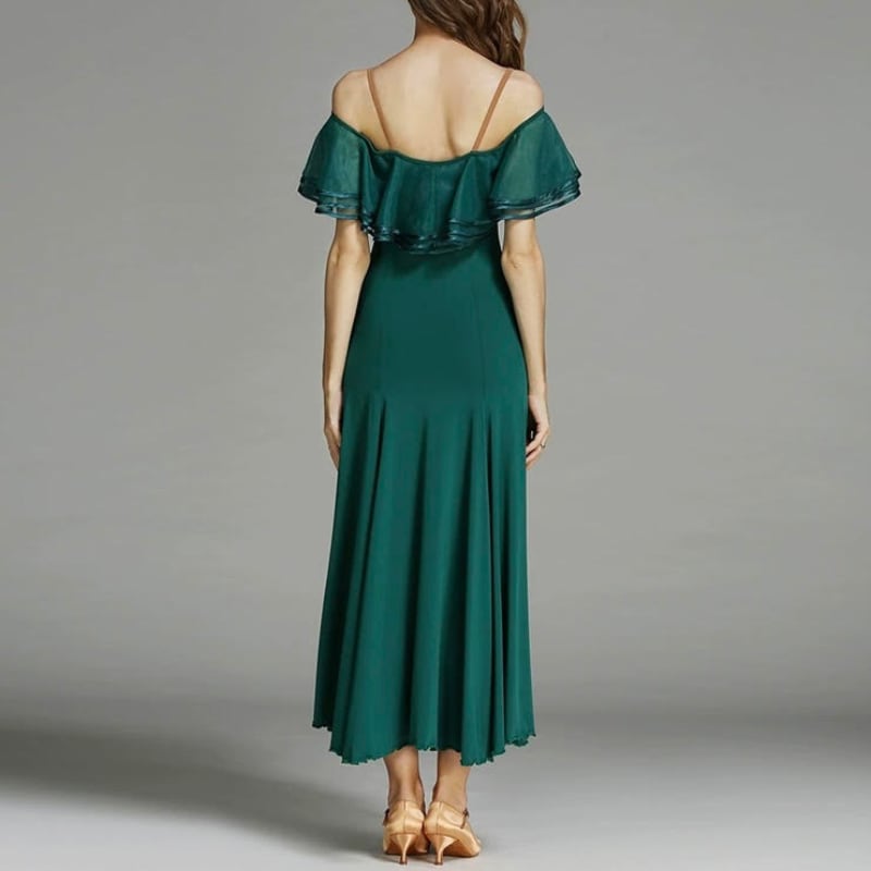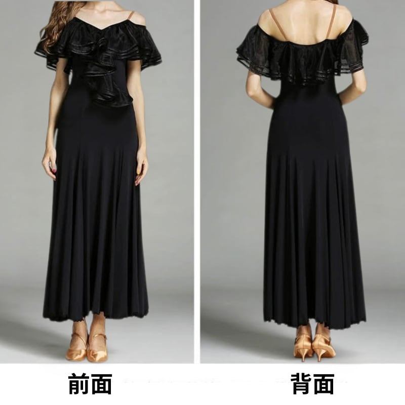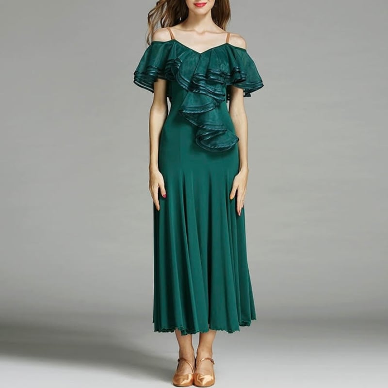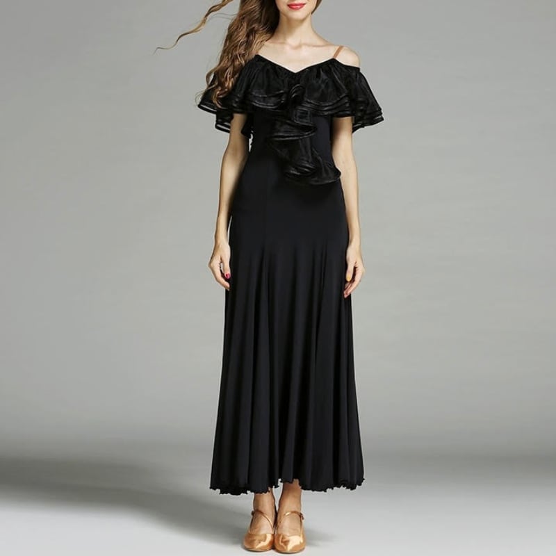 肩周りのラッフルフリルがドラマティックに揺れる、オフショルダーのダンスドレス。