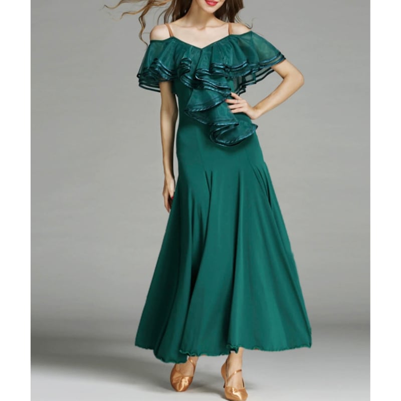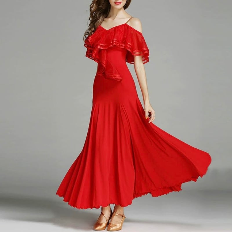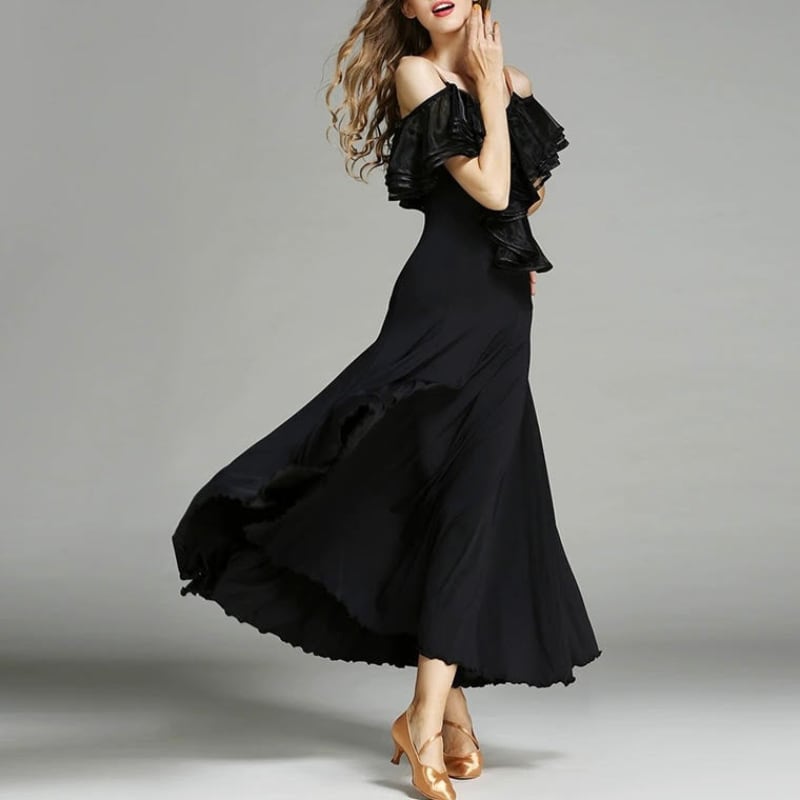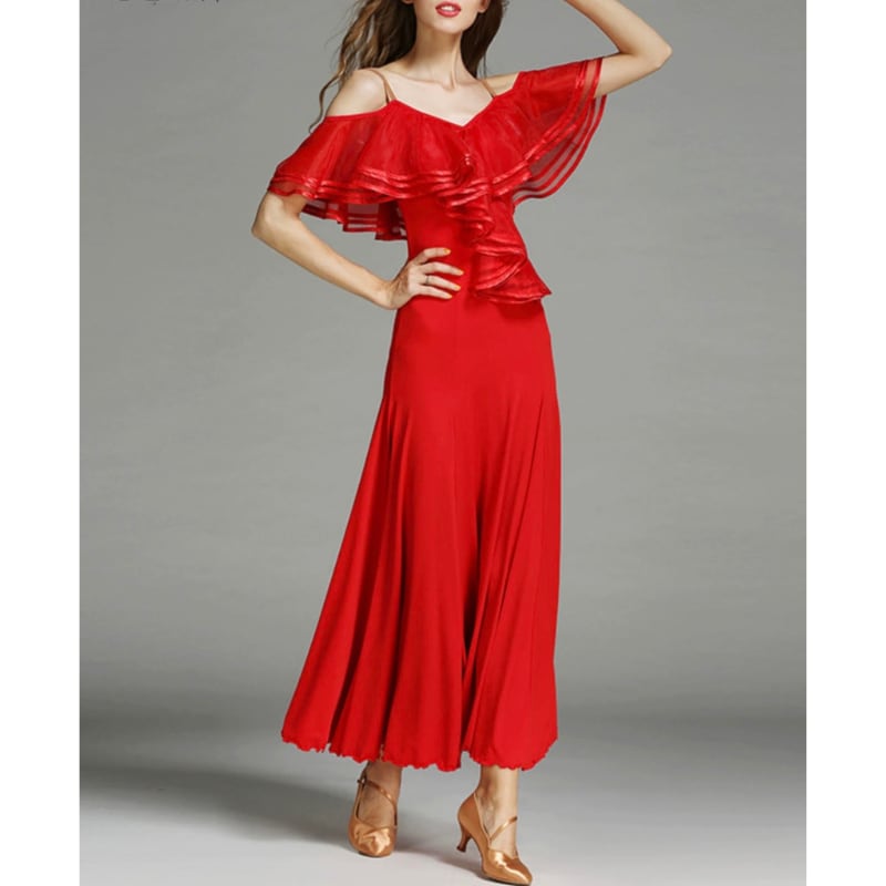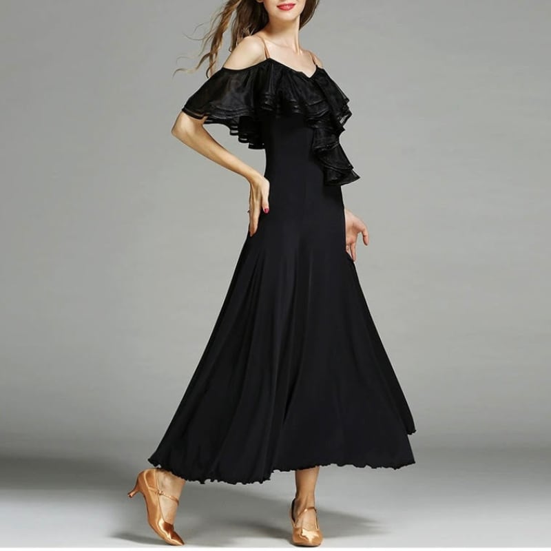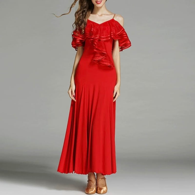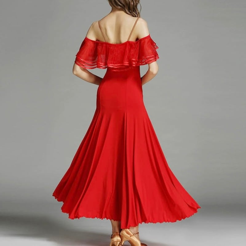 肩周りのラッフルフリルがドラマティックに揺れる、オフショルダーのダンスドレス。